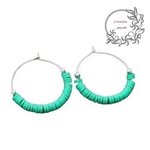 Boucle d'oreille réaliser avec des supports créoles en acier inoxydable, 2 perles rondes en métal et des rondelles couleur en fimo.