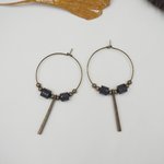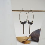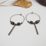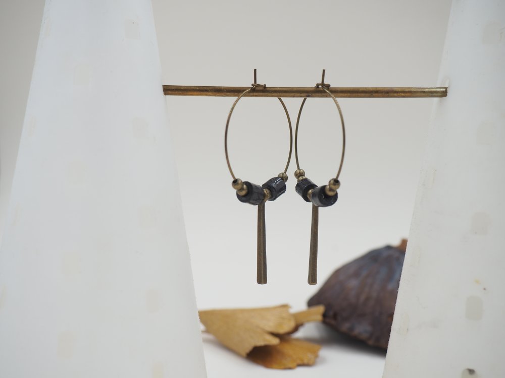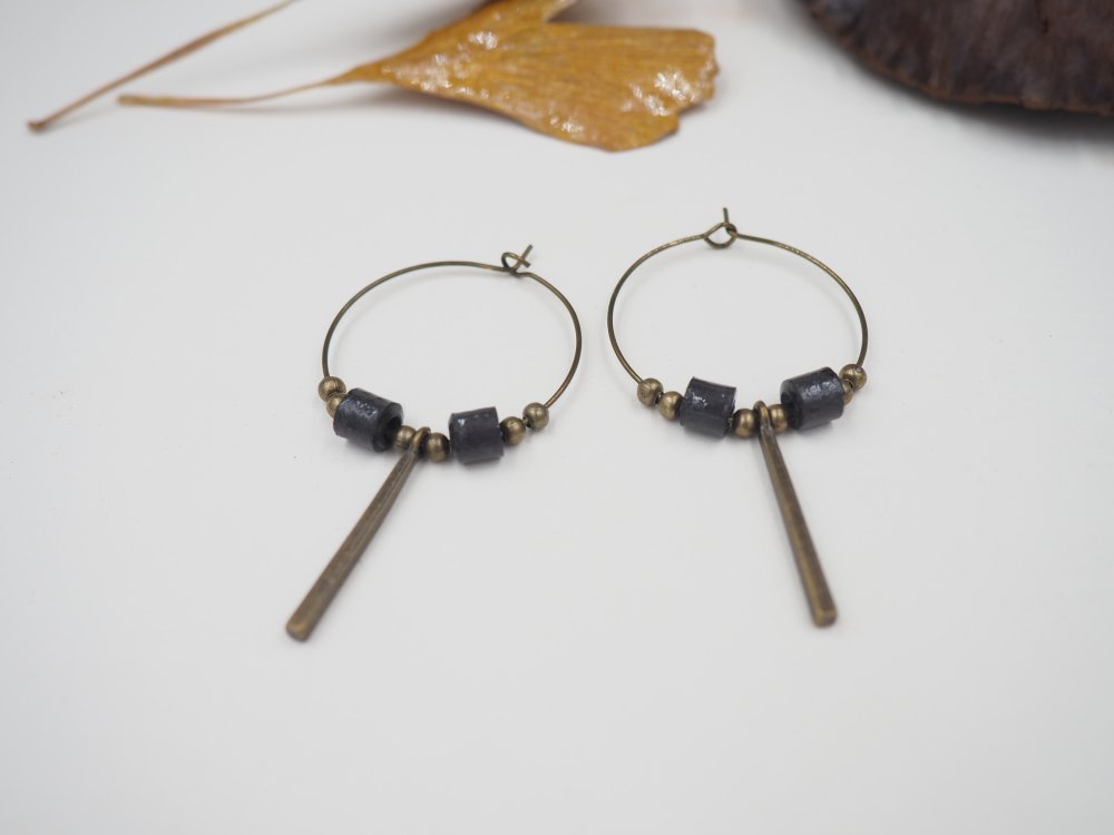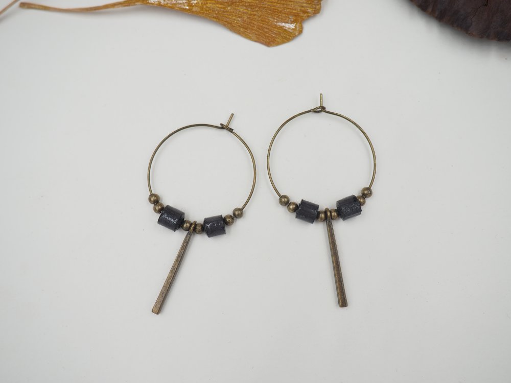 Jolies créoles composées de 4 perles de papier chiffon d'un noir intense ! petites perles de laiton et fine breloque centrale