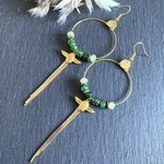 Créoles d’un diamètre de 4 cm réalisées sur un crochet d’oreille doré, de 6 perles donuts dans les tons de verts, de 4 perles en hématite doré, d’une breloque scarabée de 20X12 mm en acier inoxydable doré.