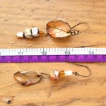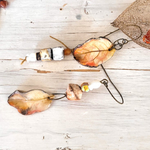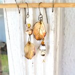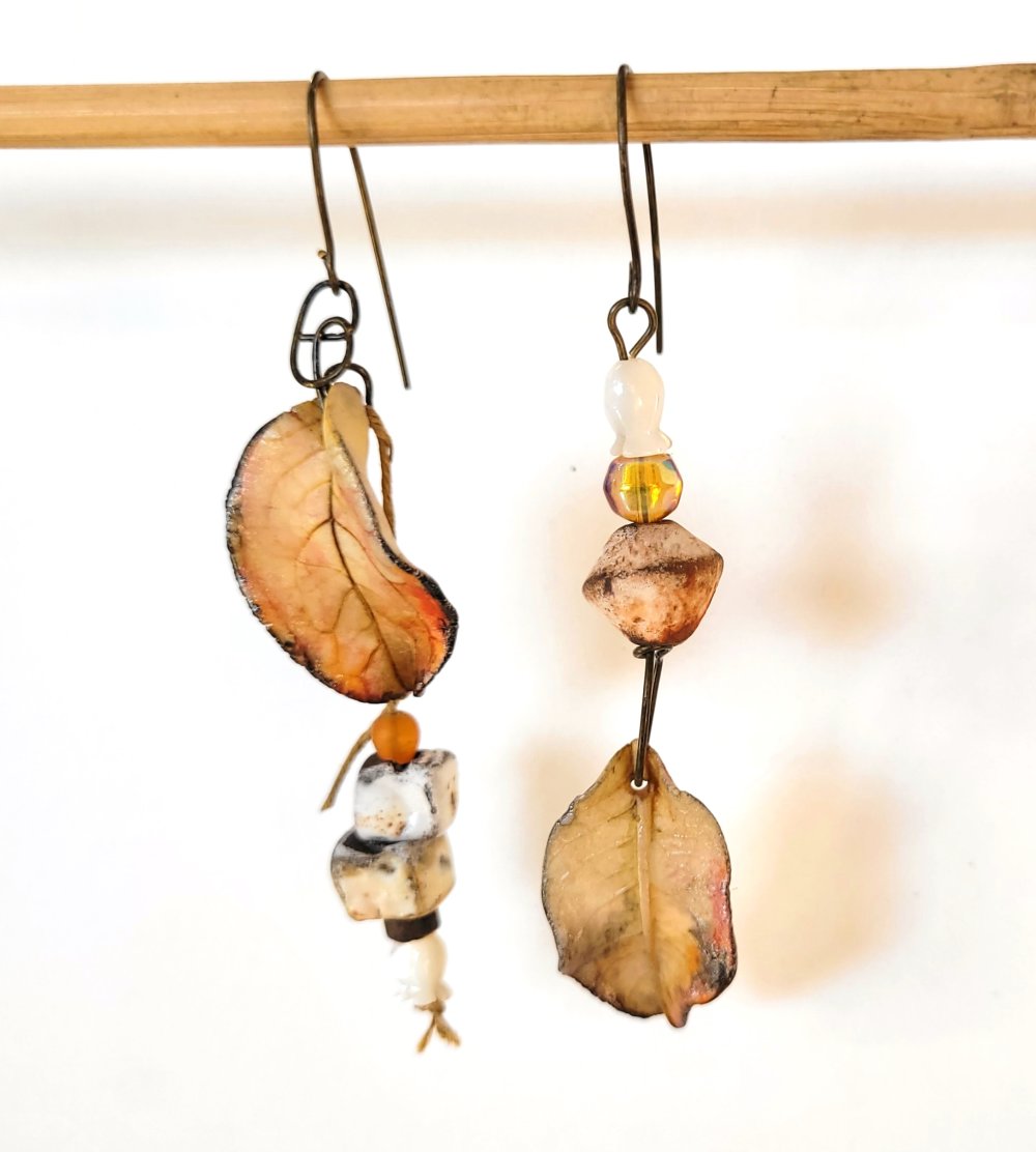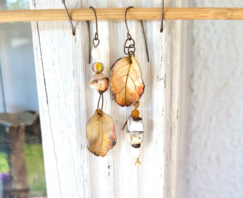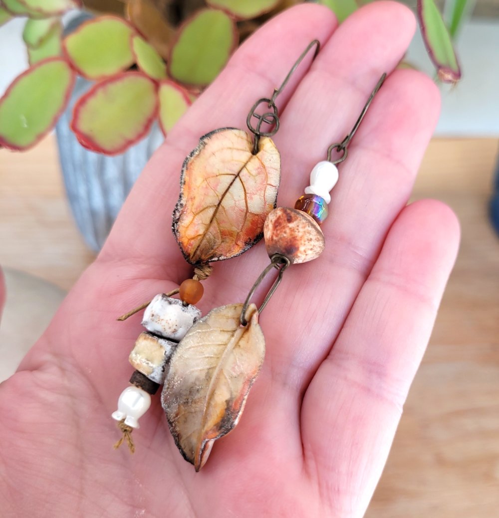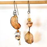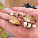 "Murmures Des Bois" : Des boucles d'oreille asymétriques; primitives tribales organiques : elles sont composées de splendides perles feuilles en porcelaine de Virginie, coton ciré camel avec perles cubes en céramique artisanale, perle en pâte de verre, tulipes en nacre !!