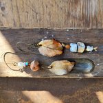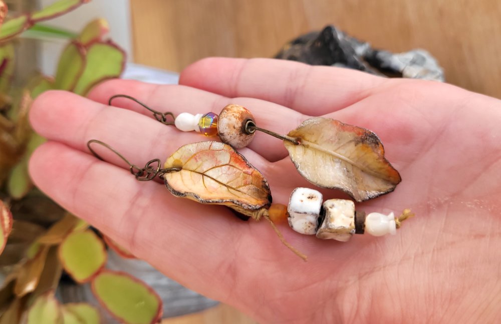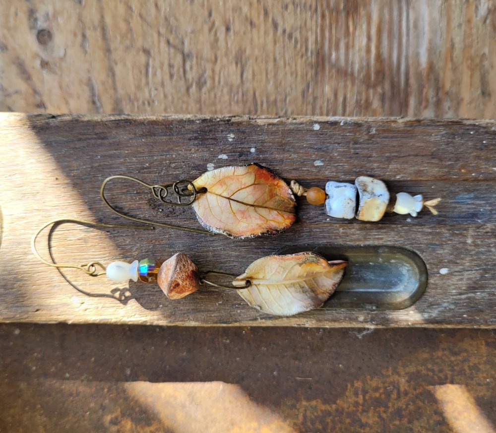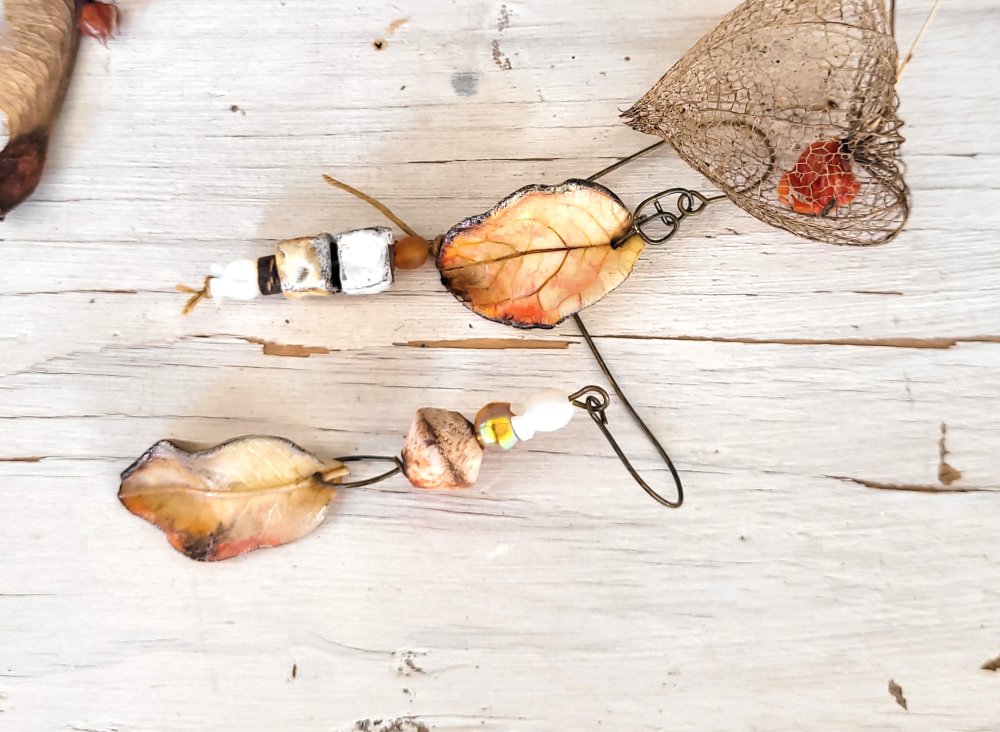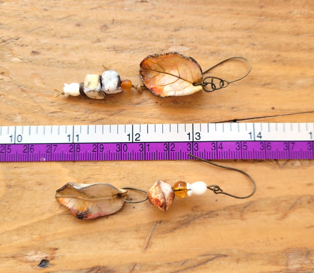 "Murmures Des Bois" : Des boucles d'oreille asymétriques; primitives tribales organiques : elles sont composées de splendides perles feuilles en porcelaine de Virginie, coton ciré camel avec perles cubes en céramique artisanale, perle en pâte de verre, tulipes en nacre !!