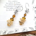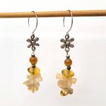 Des boucles d'oreille contemporaines, citadines, coquettes et réalisées avec des pointes de kunzite, perles en citrine, soucoupes en verre, perles ambre, perle bronze et argent et intercalaire fleur en étain: "Filles de l'Automne"....