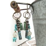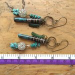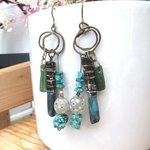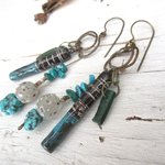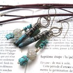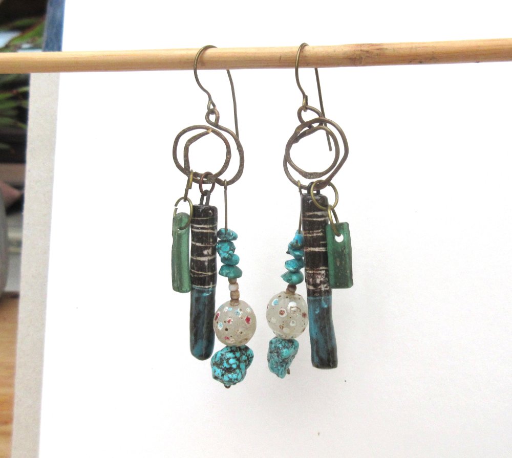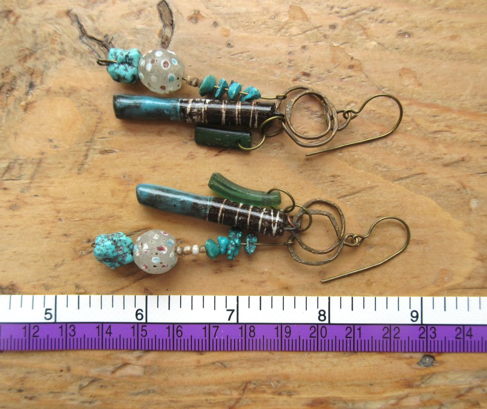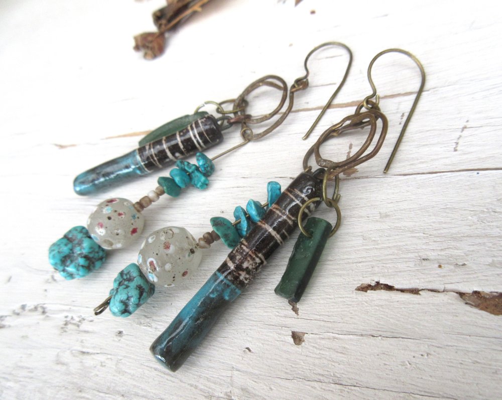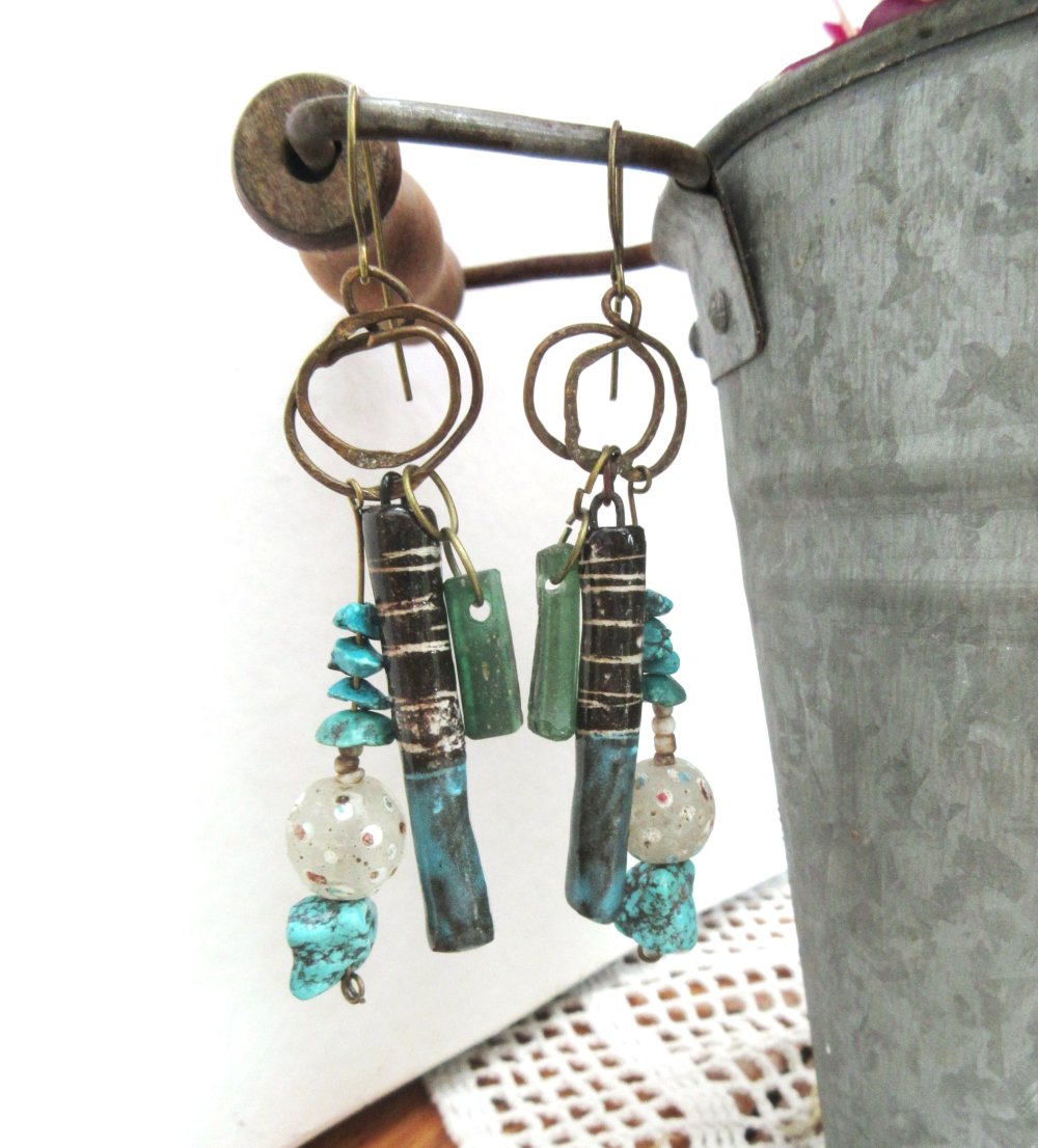 Boucles d'oreille de caractère, citadines, shabby chics "Frissons De La Nature" : elles sont réalisées avec des nuggets turquoise d'Arizona, formidables porcelaines de Petra, perles turquoise, anciennes perles vénitiennes en verre; tubes en verre époque romaine et perles africaines ; breloques en bronze patine rustique de ma composition.
