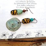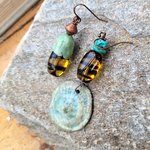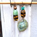 Des boucles d'oreille romantiques et asymétriques, chics, urbaines : c'est une main de poète qui a façonné ces breloques en porcelaine; accompagnées de perles en verre abeille, perles - disques en turquoise, perle bicône en pur cuivre ...