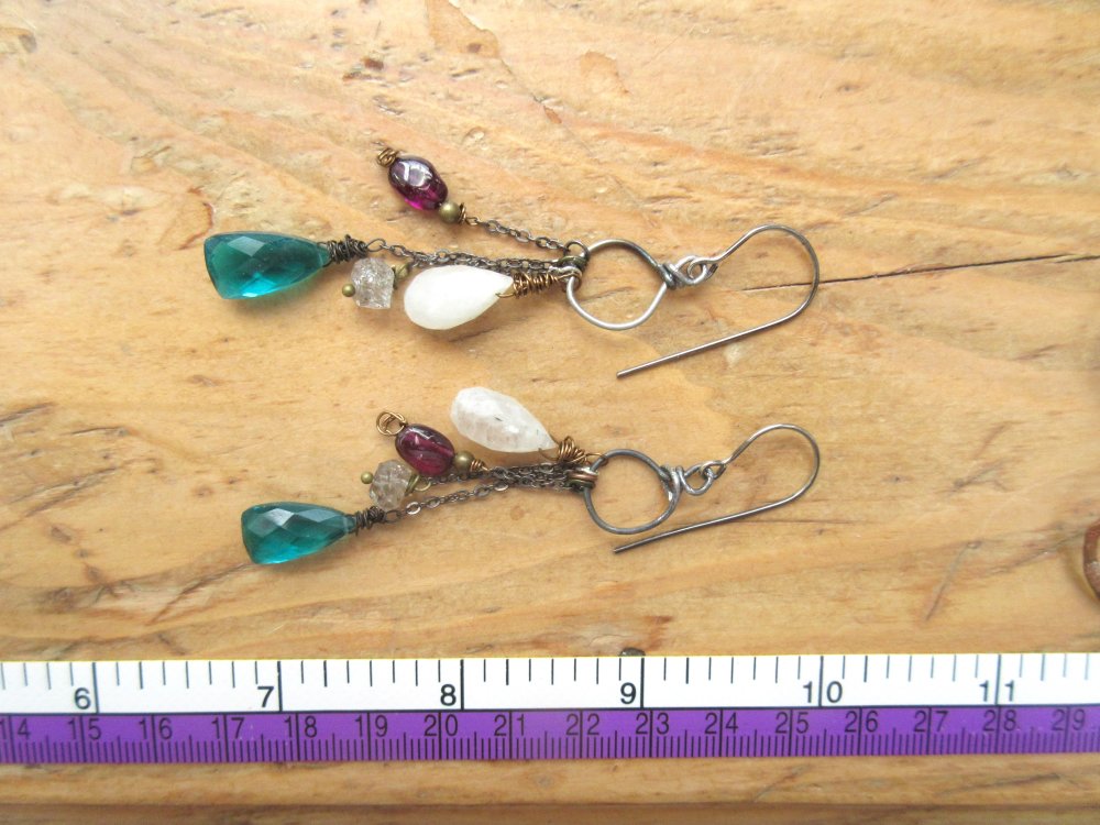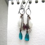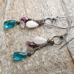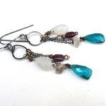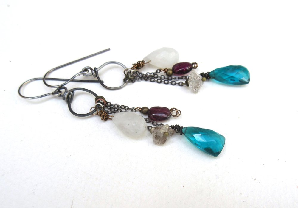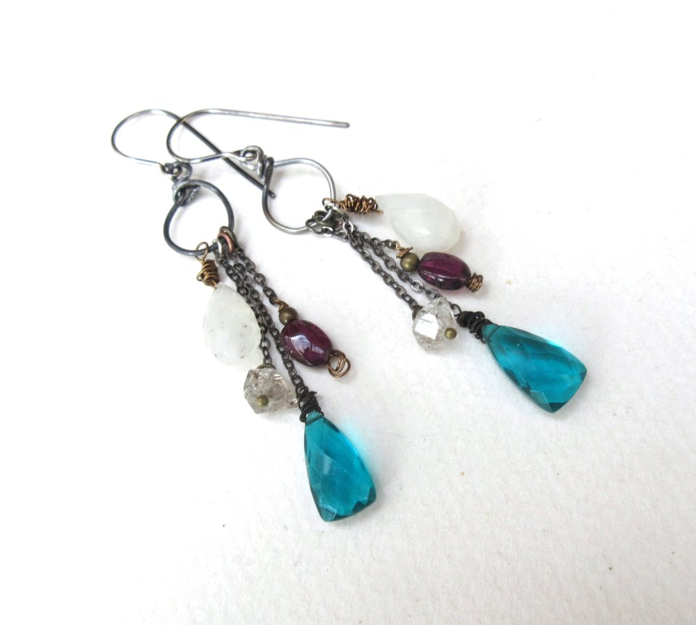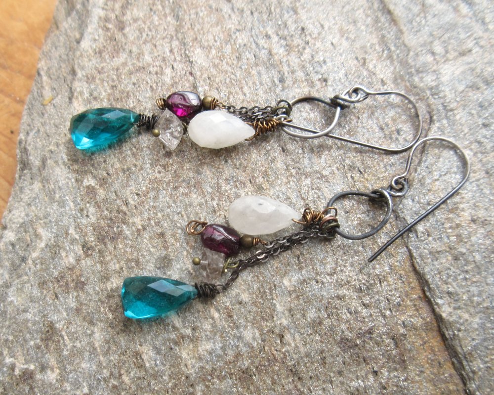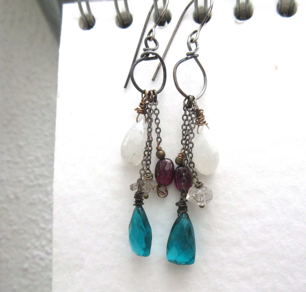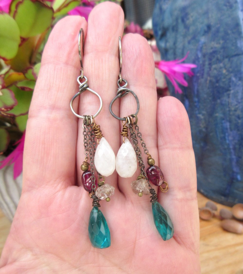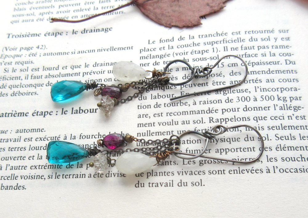 Des boucles d'oreille romantiques, tribes, grungy : "Un Envol Sauvage": aériennes, elles sont composées d' un cercle en métal vieil argent avec chaînes en argent et où sont suspendues des briolettes : pierre de lune facettée, perle bleu Paon quartz facettée, herkimer diamant et une perle en grenat rhodolite ....