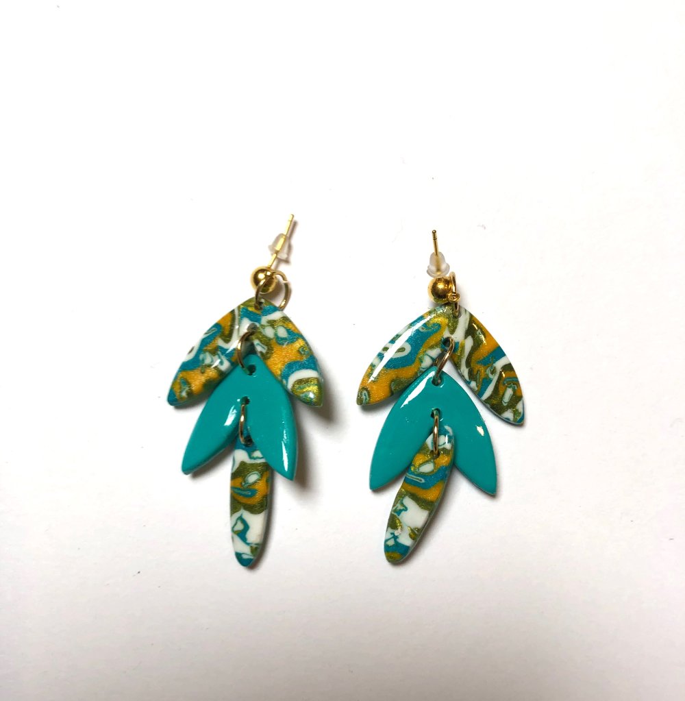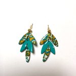 Originales et lumineuses, longues boucles d’oreilles ( 5cm) feuillage, comme une ode au printemps…Tons de vert, jaune, blanc, bleu turquoise.