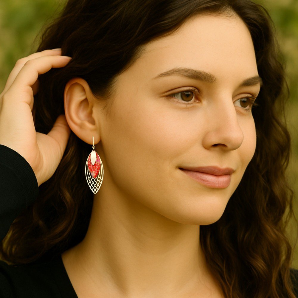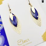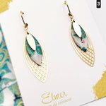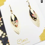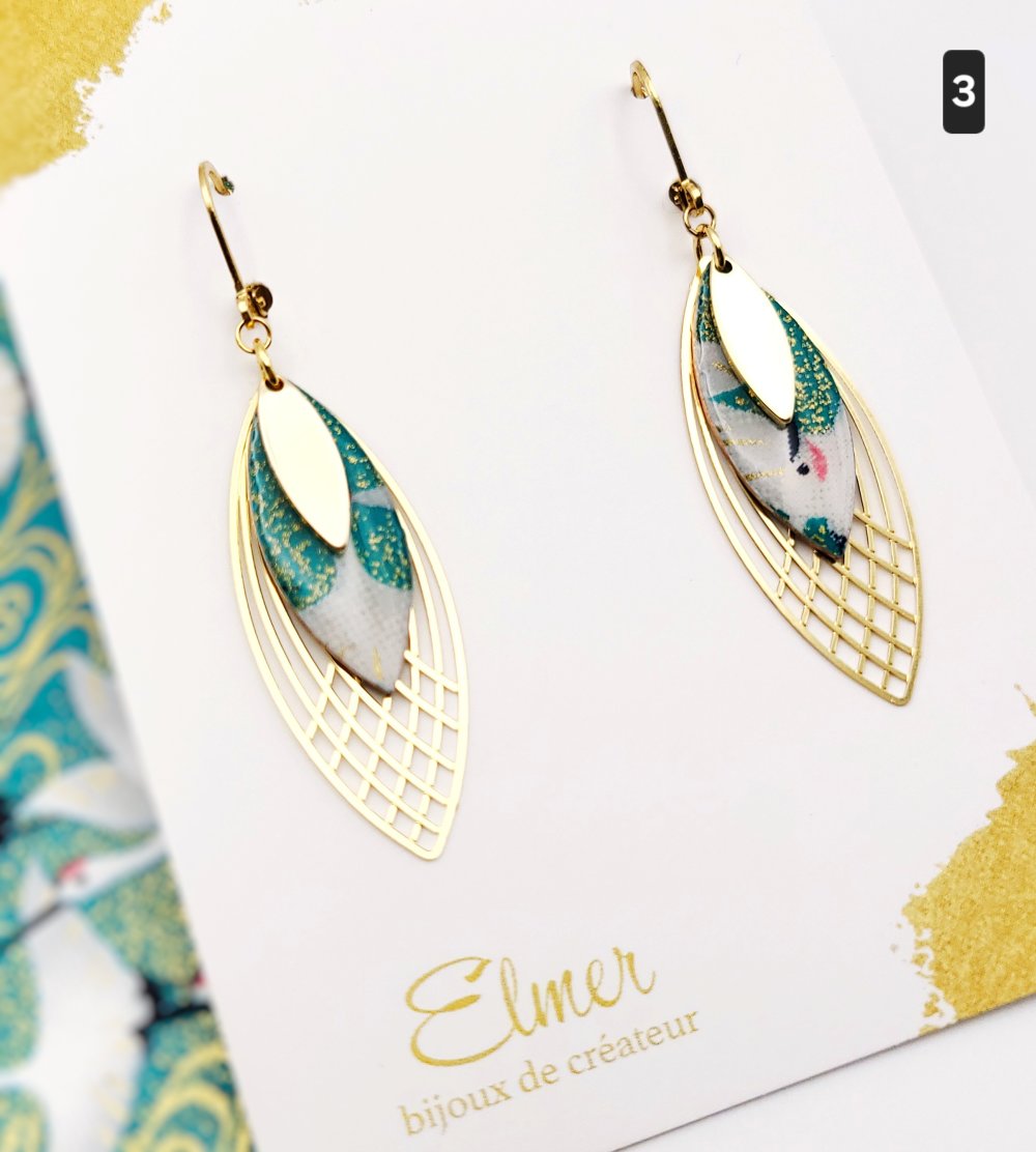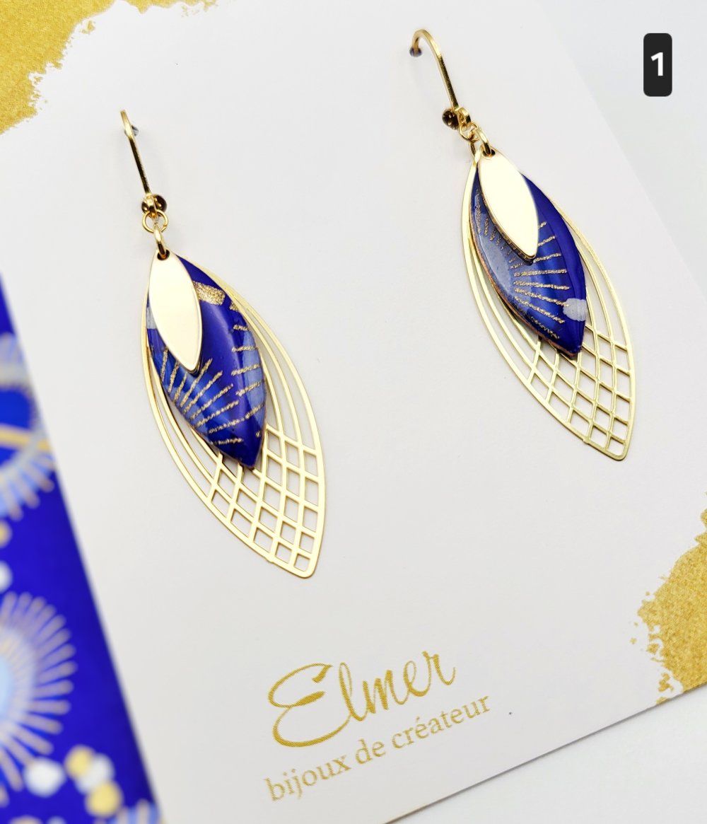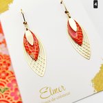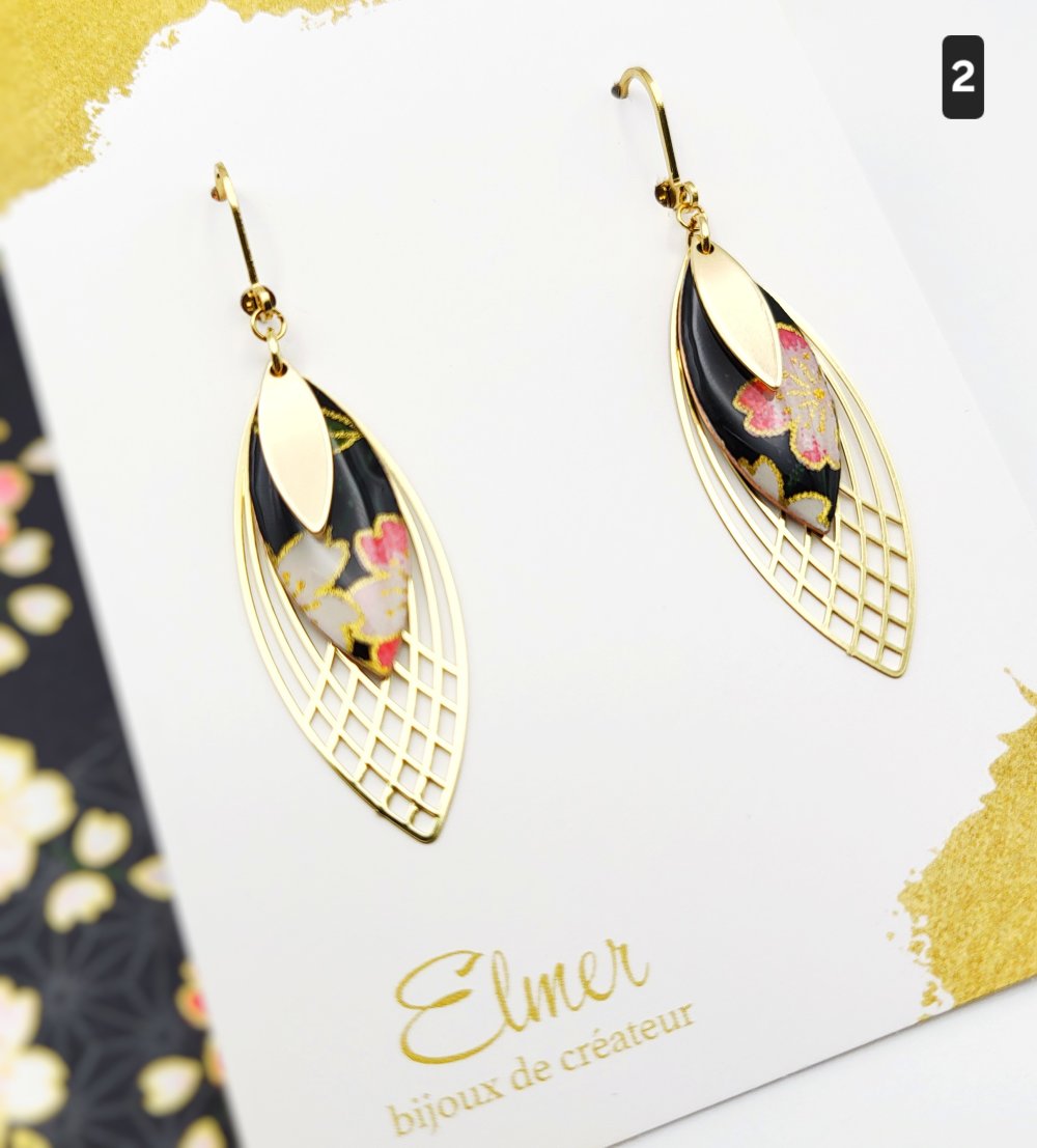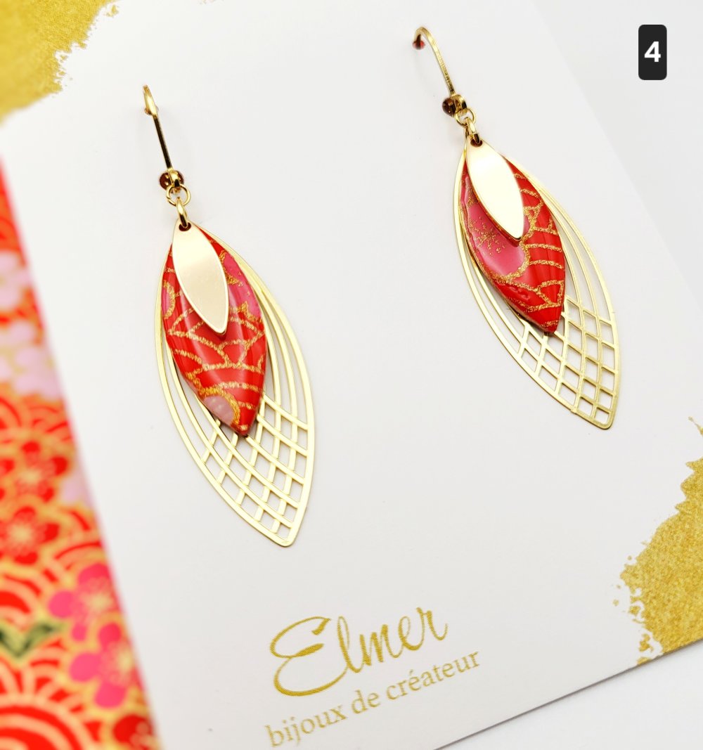 Elles associent une navette ajourée dorée à une pampille en papier washi japonais, protégée par une fine résine et rehaussée d’émaux assortis au dos.