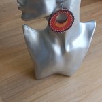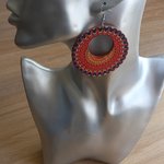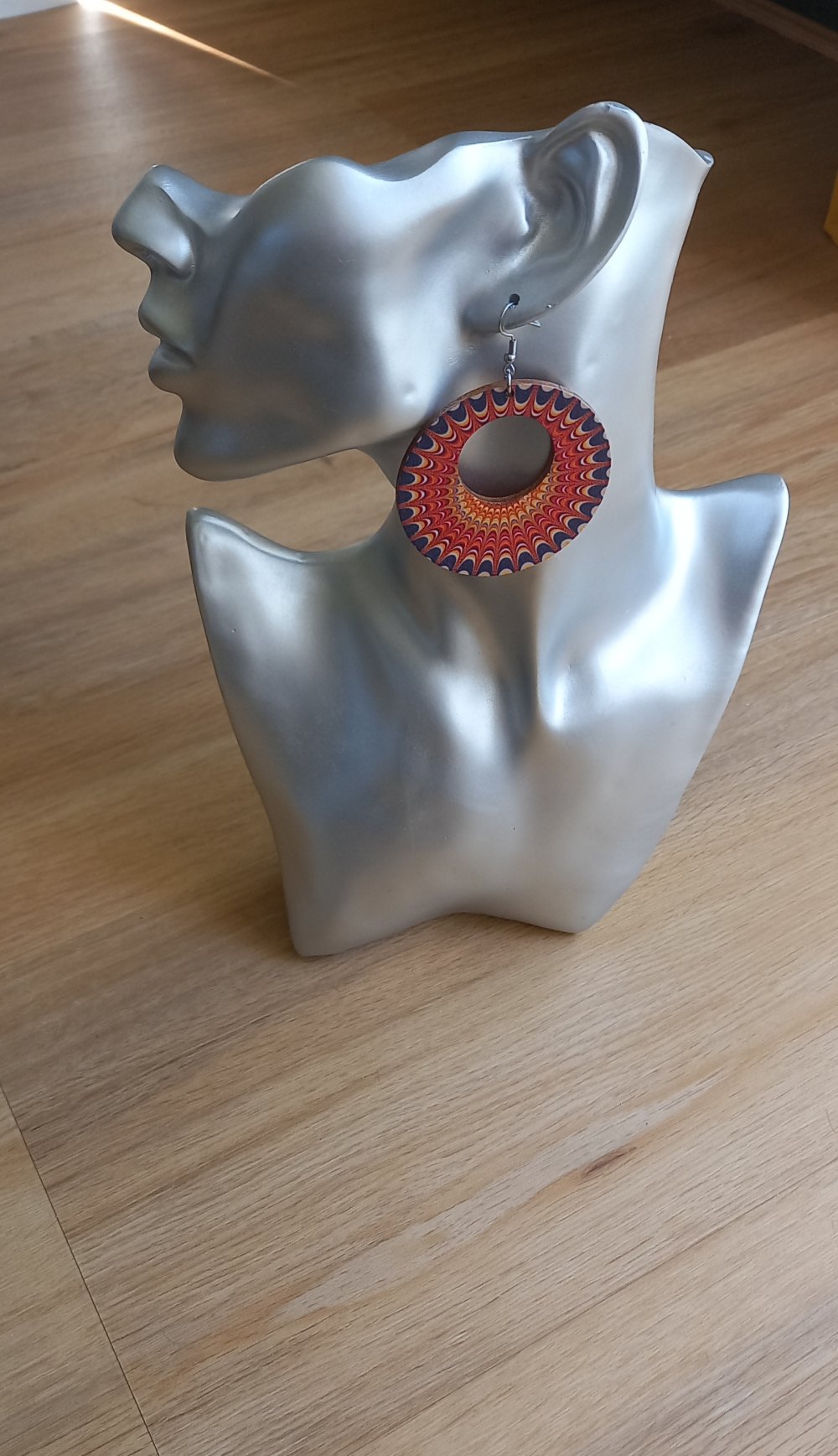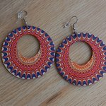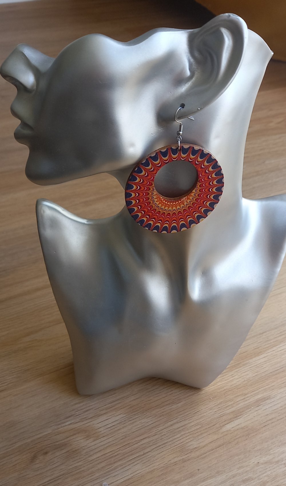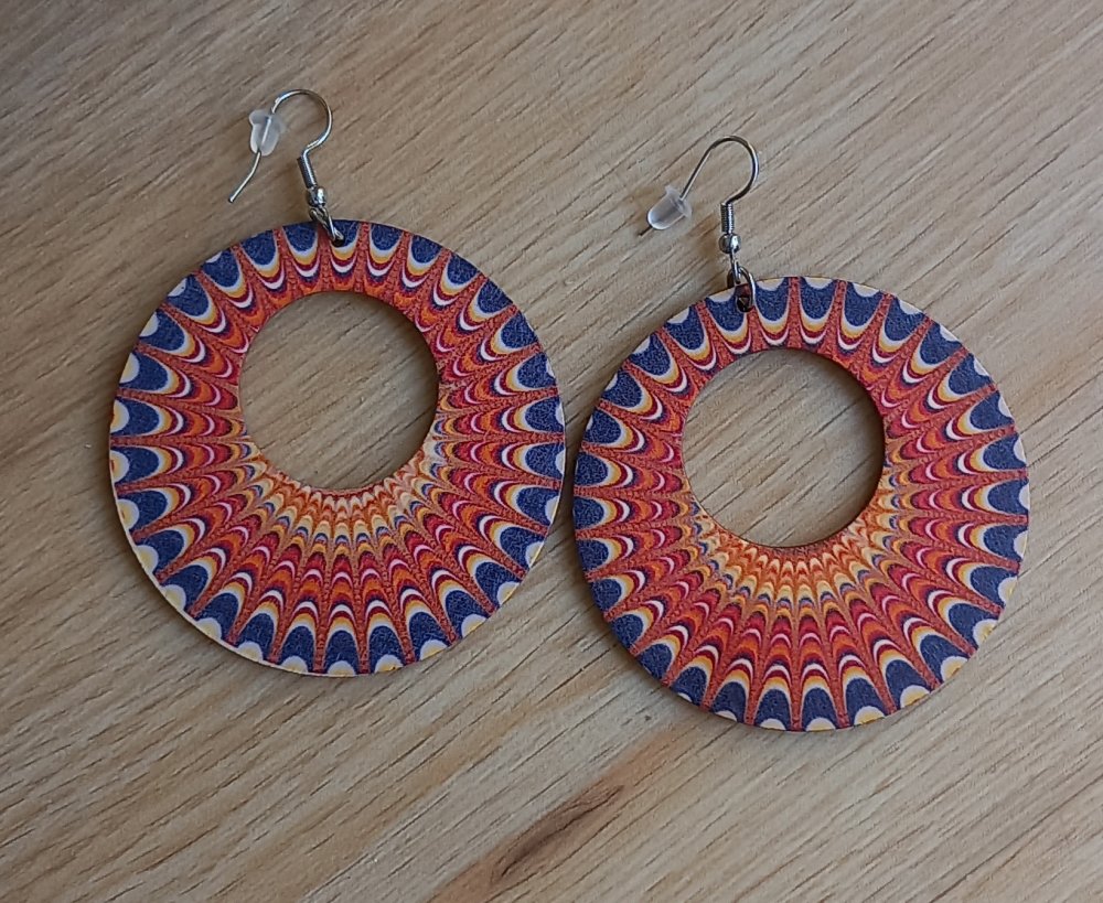 Grande boucles d'oreilles en bois de coco, très très légères et crochets d'oreille en acier inoxydable. Même imprimé recto verso. Mélange de couleurs (orange, beige, brun, violet). Elles existent dans d'autres coloris (Voir modèles sur photo).
