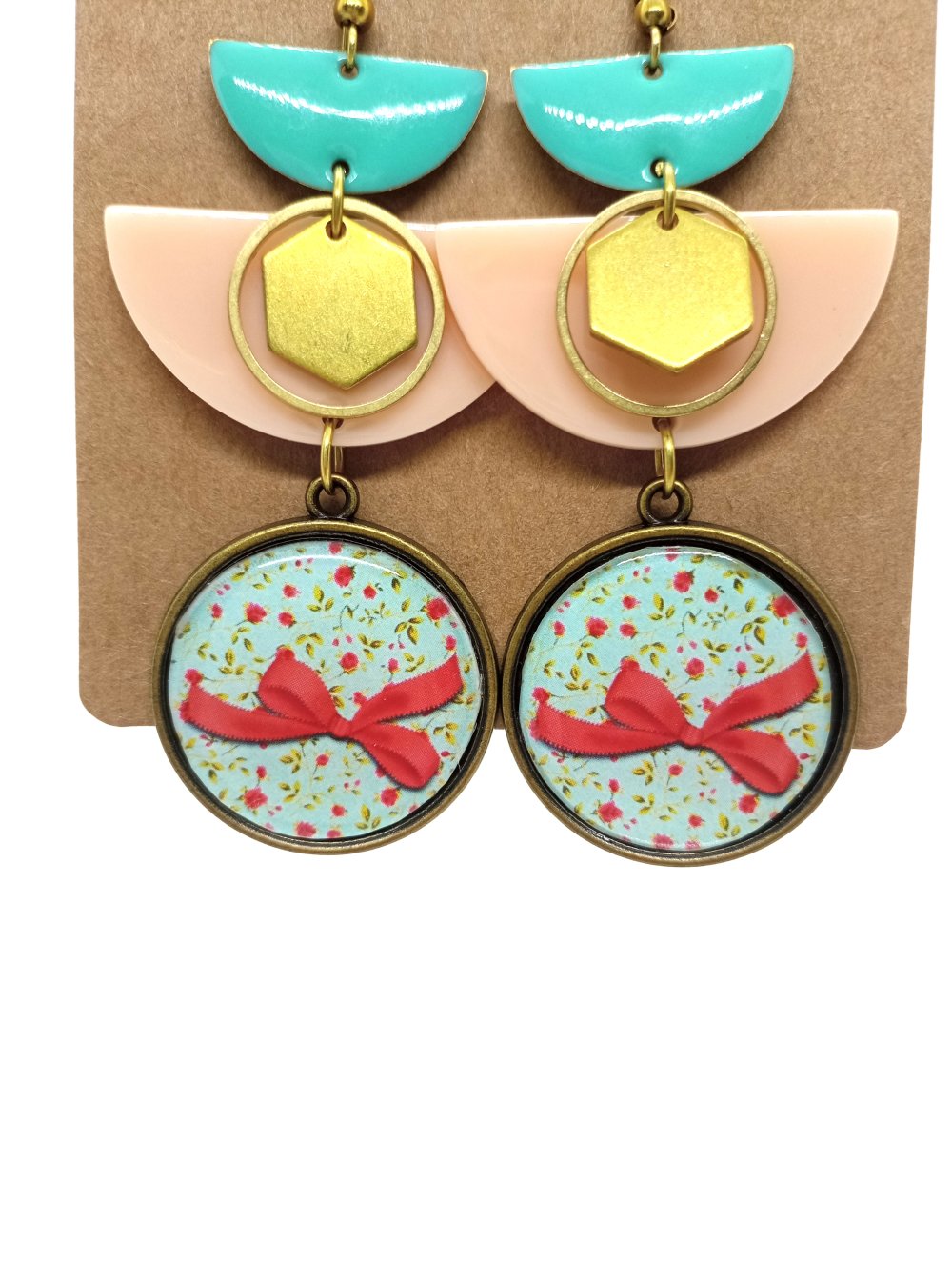 Cette paire de grandes boucles d'oreilles en laiton doré a été réalisée à partir de jolis connecteurs en acrylique roses et émaillés bleus ; et de pendentifs avec illustrations *nœuds liberty* recouvertes de cabochons en résine.