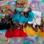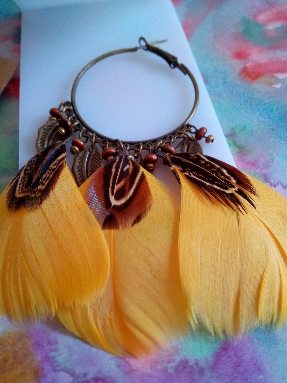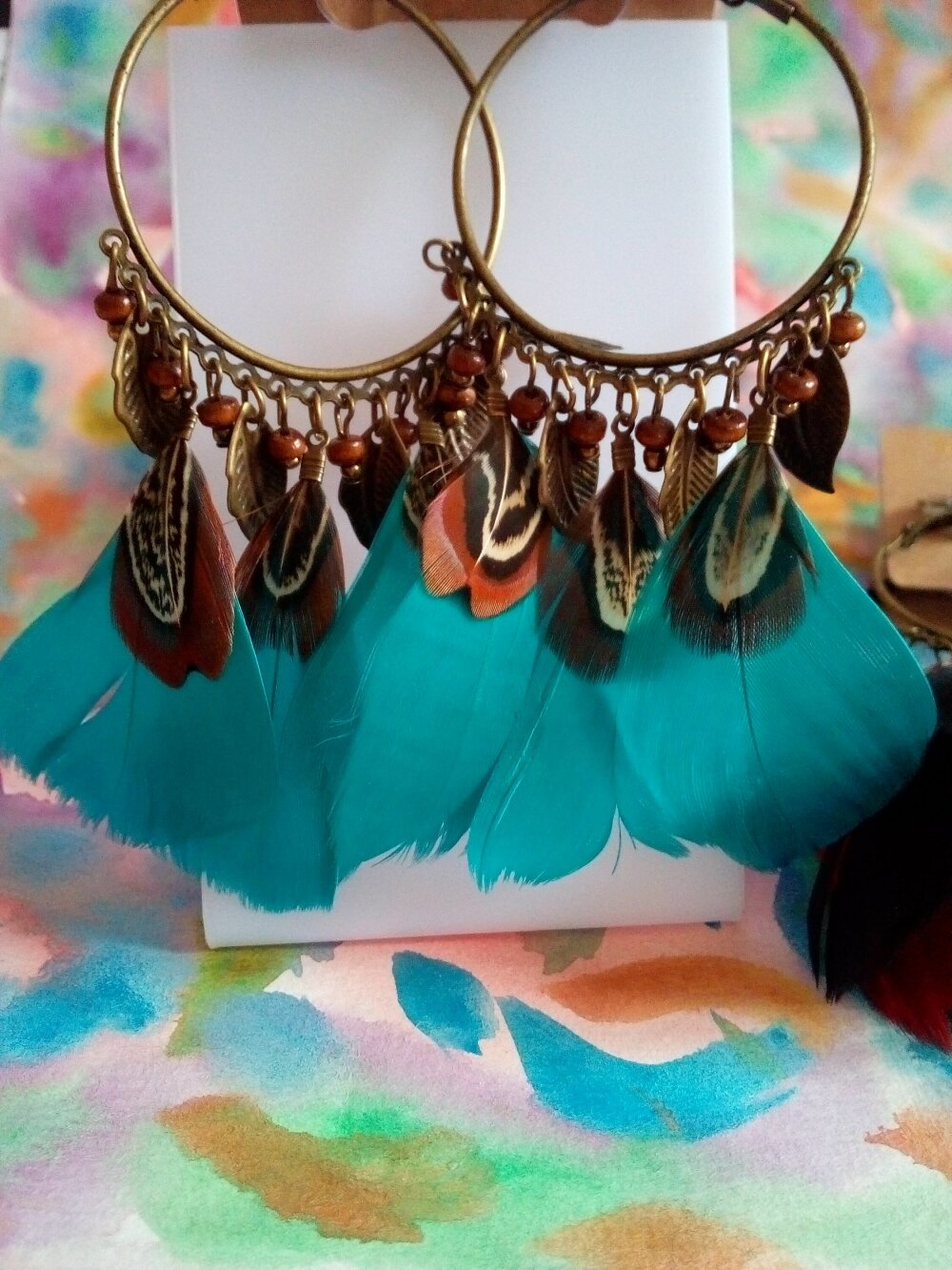 Grandes boucles oreilles créoles laiton avec longues plumes,perles de bois et breloques feuilles,cadeau fete anniversaire noel