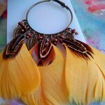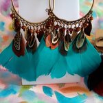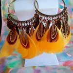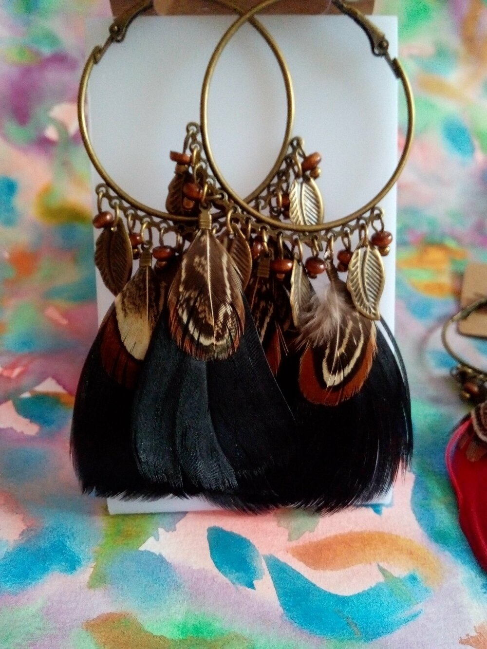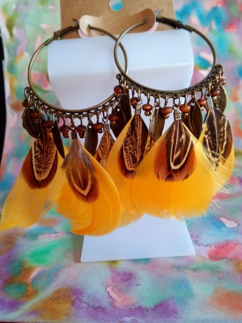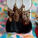 Grandes boucles oreilles créoles laiton bronze avec de longues plumes, des perles de bois et des breloques feuilles,fermoir poussoir,