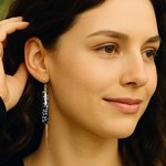 La pièce centrale, une fine tige rectangulaire dorée, est rehaussée d’une barre dorée et prolongée de deux chaînettes souples qui dansent à chaque mouvement — l’élégance tout en légèreté.
