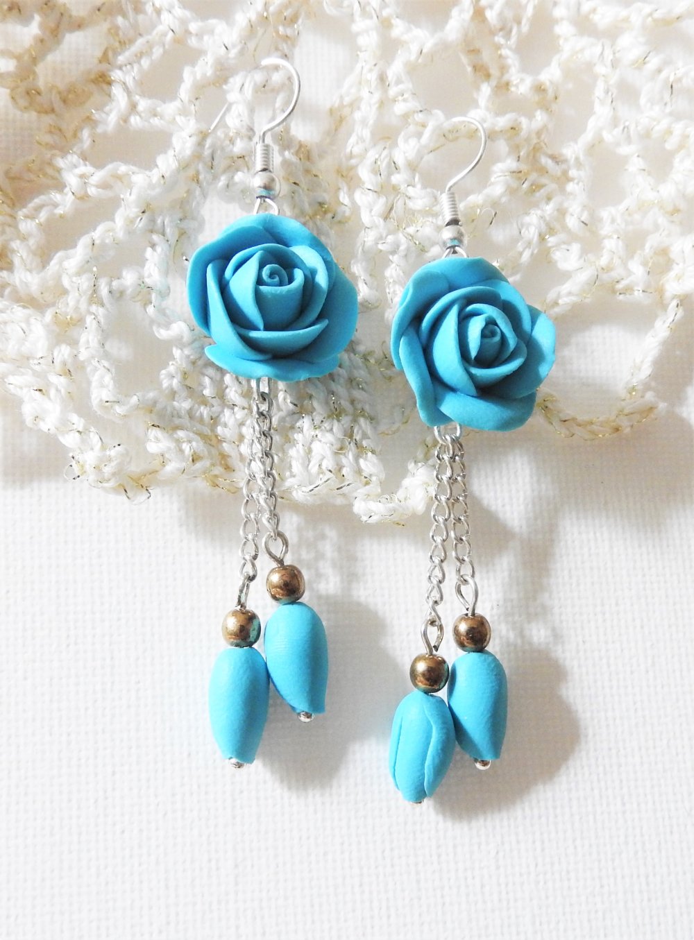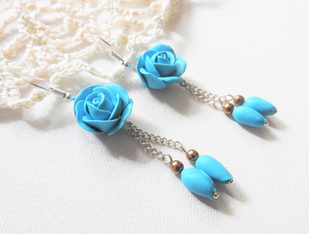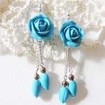 les boucles d oreilles, couleur turquoise, longueur 7.5 cm! création unique,  fleur rose en fimo.