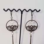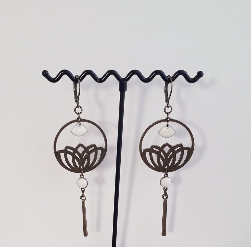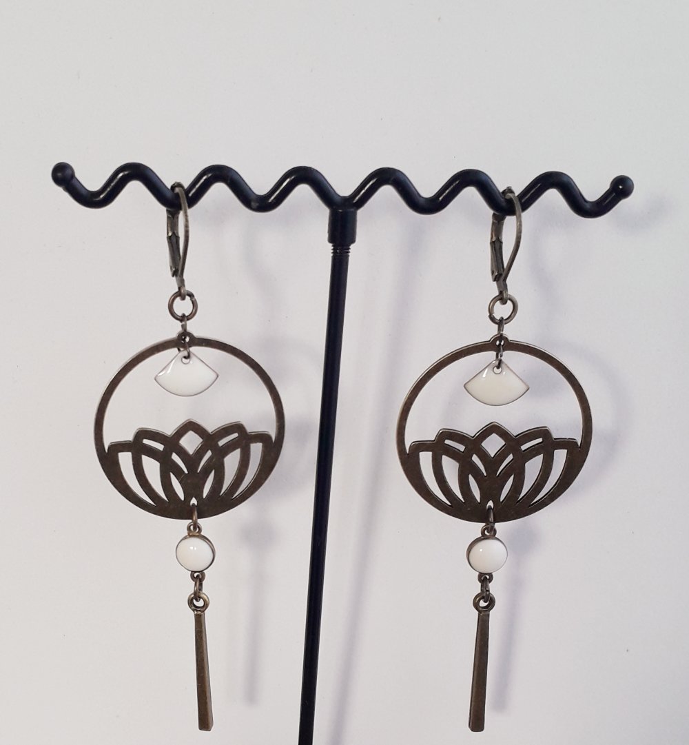 Longues boucles d'oreilles esprit vintage, émail blanc, laiton bronze, faites main, création personnelle.