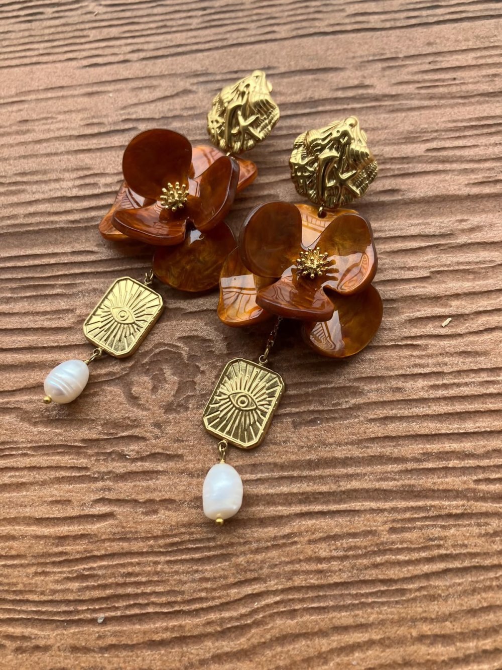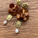 Longues boucles romantiques fleur en résine epoxy, acier, plaqué or et perle naturelle d eau douce