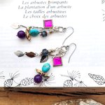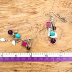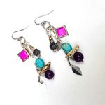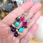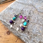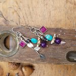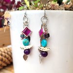 "Modulations Du Temps" : merveilleuses boucles d'oreille tribales et primitives, un peu bohème aussi : on y trouve : des perles en améthyste, des perles verre cathédrale bleu, turquoise, breloques verre vitrail, , perles verre Picasso, graine, chaîne en argent avec feuilles .. qui dansent sous de petites créoles en argent ....