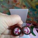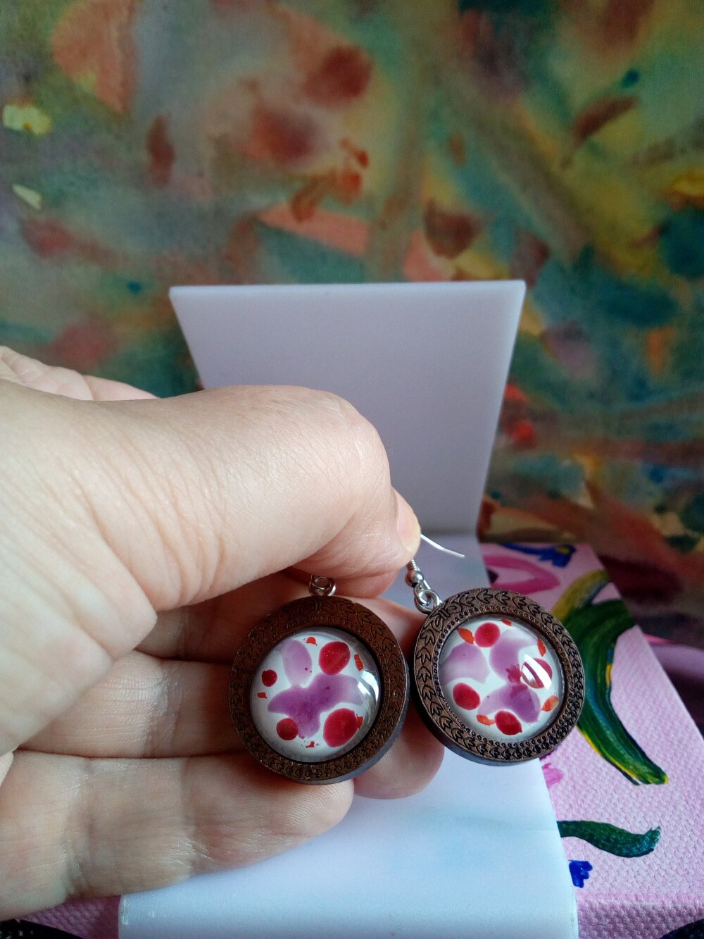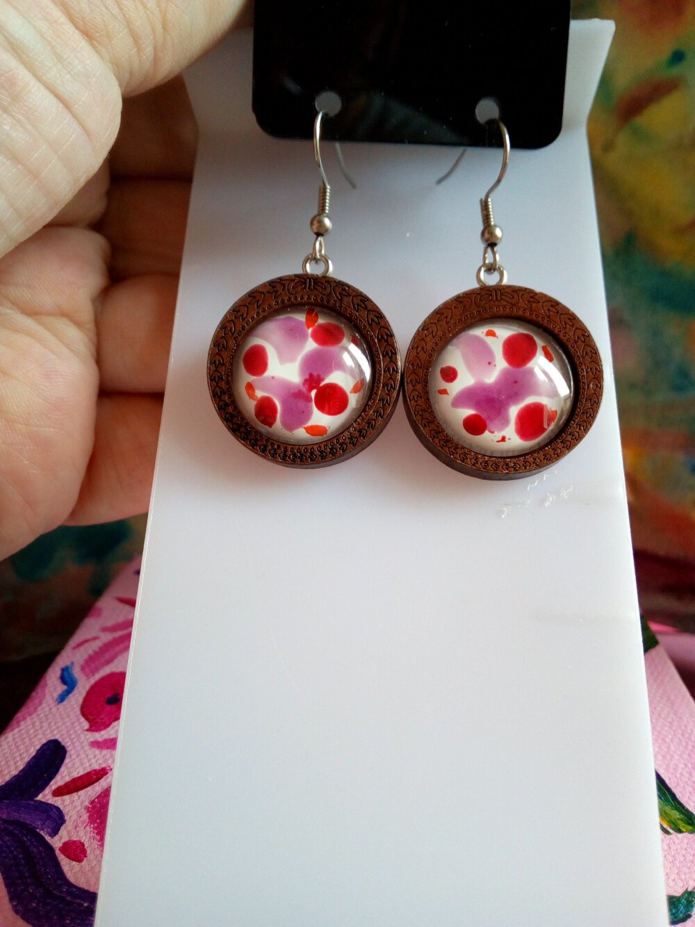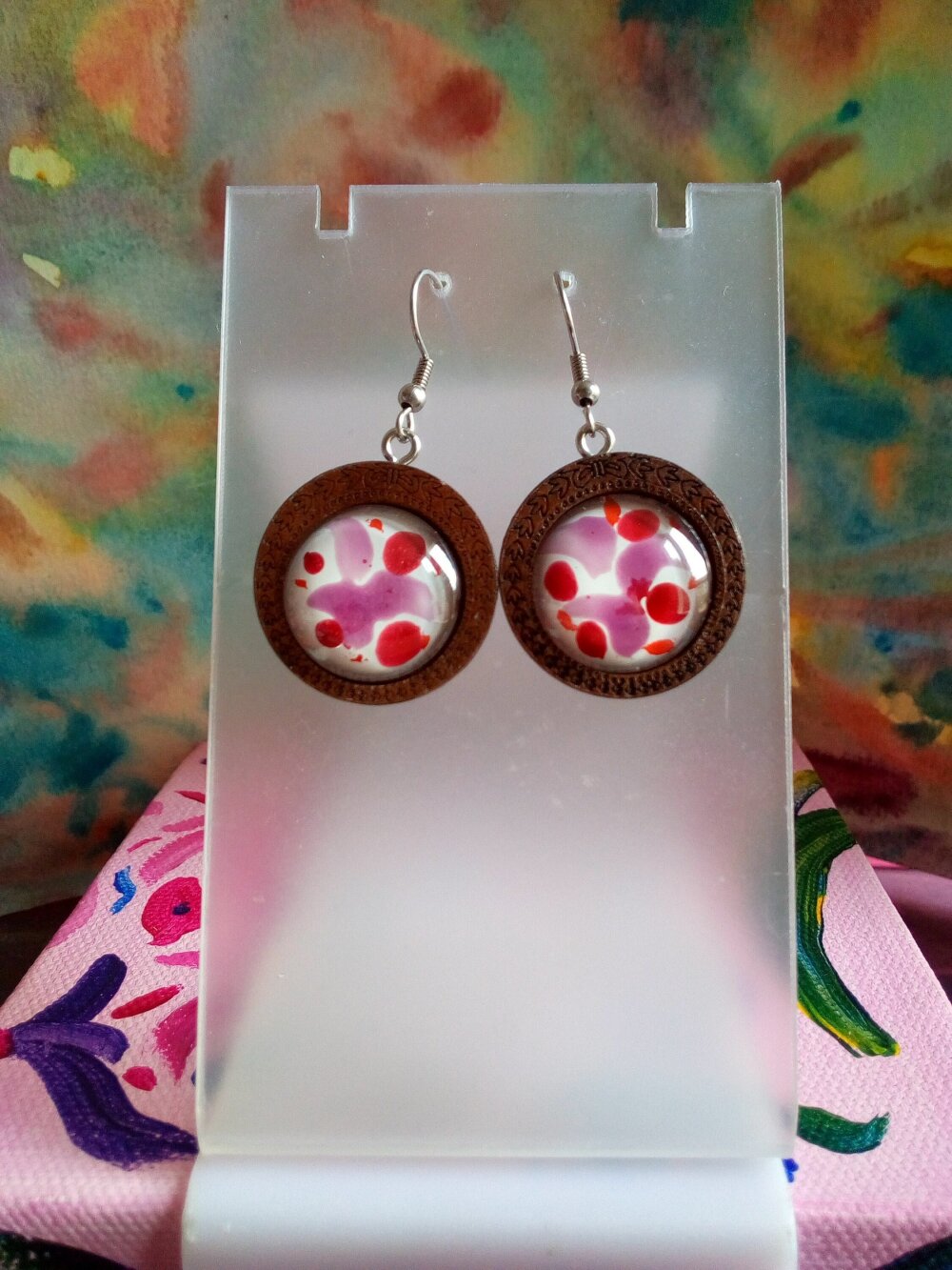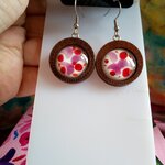 Peint artiste isabelle k,boucles oreilles bois fleuri avec cabochons ronds verre violet rose blanc,crochets acier,cadeau fete anniversaire