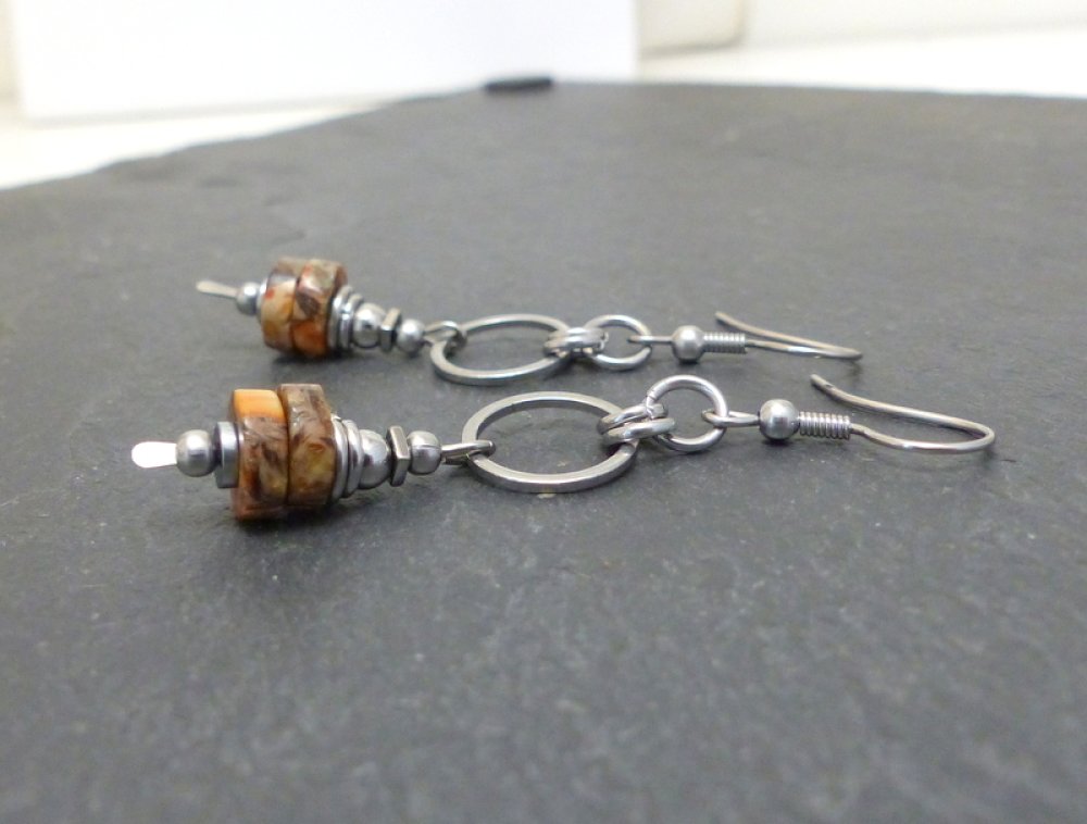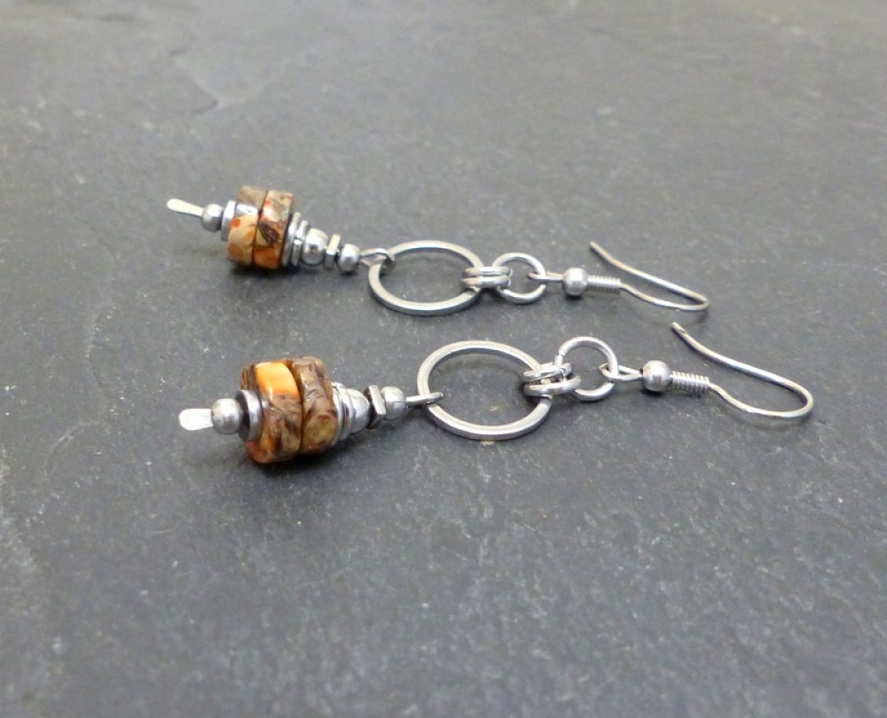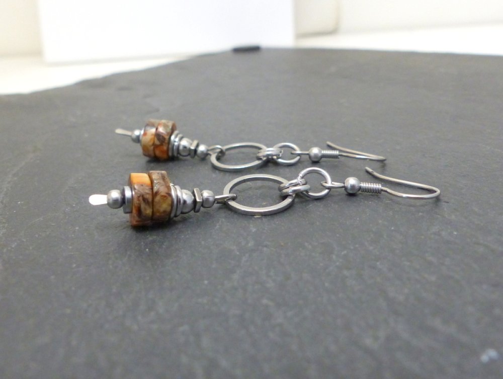 Eléments en acier inoxydable, rondelles de jaspe impérial marron, orange, ocre.