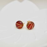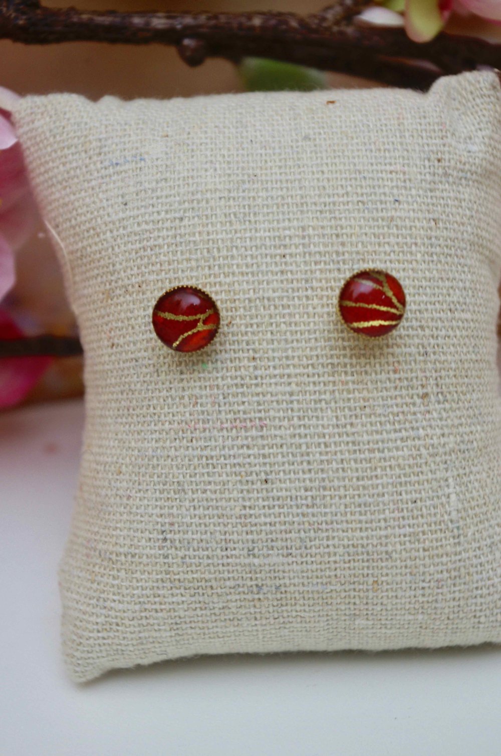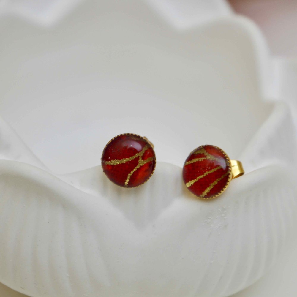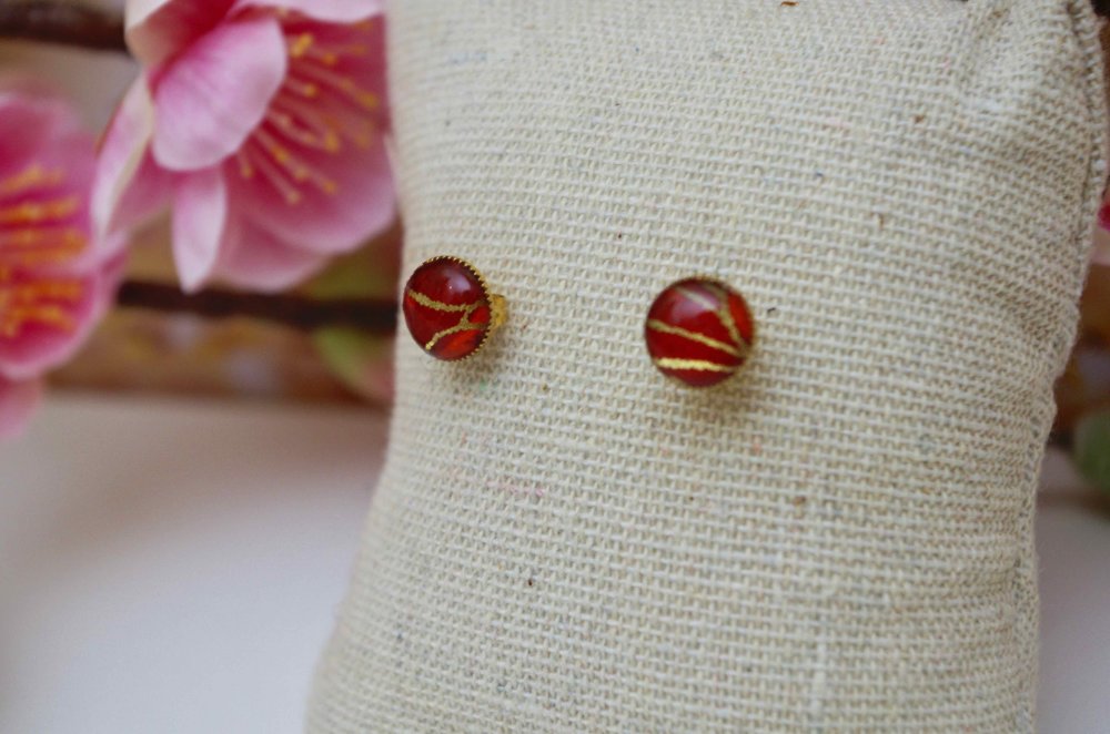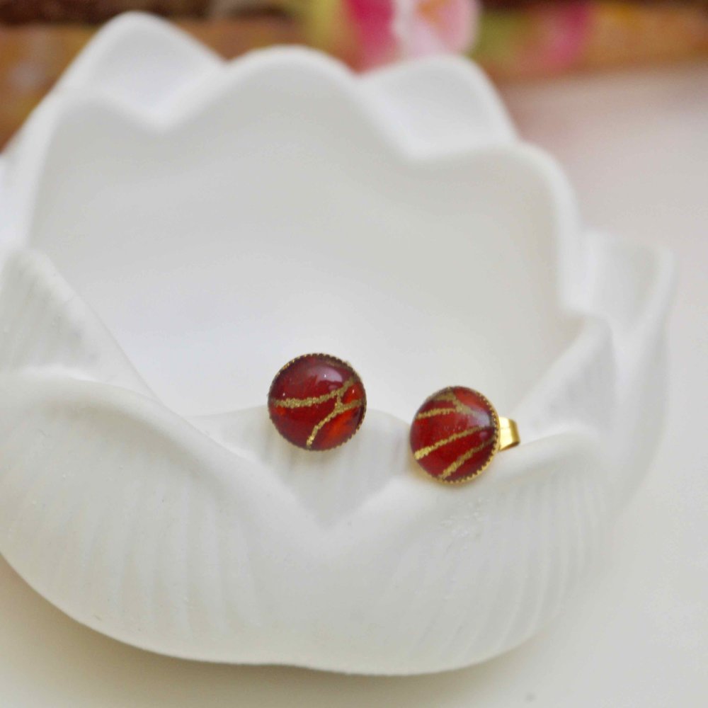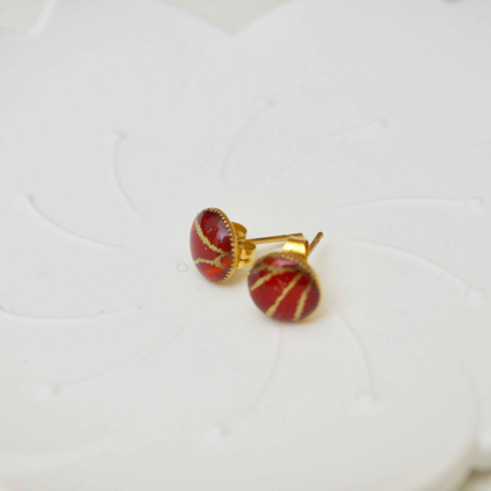 Petites Boucles d'oreilles puces minimaliste avec du papier washi rouge doré en acier