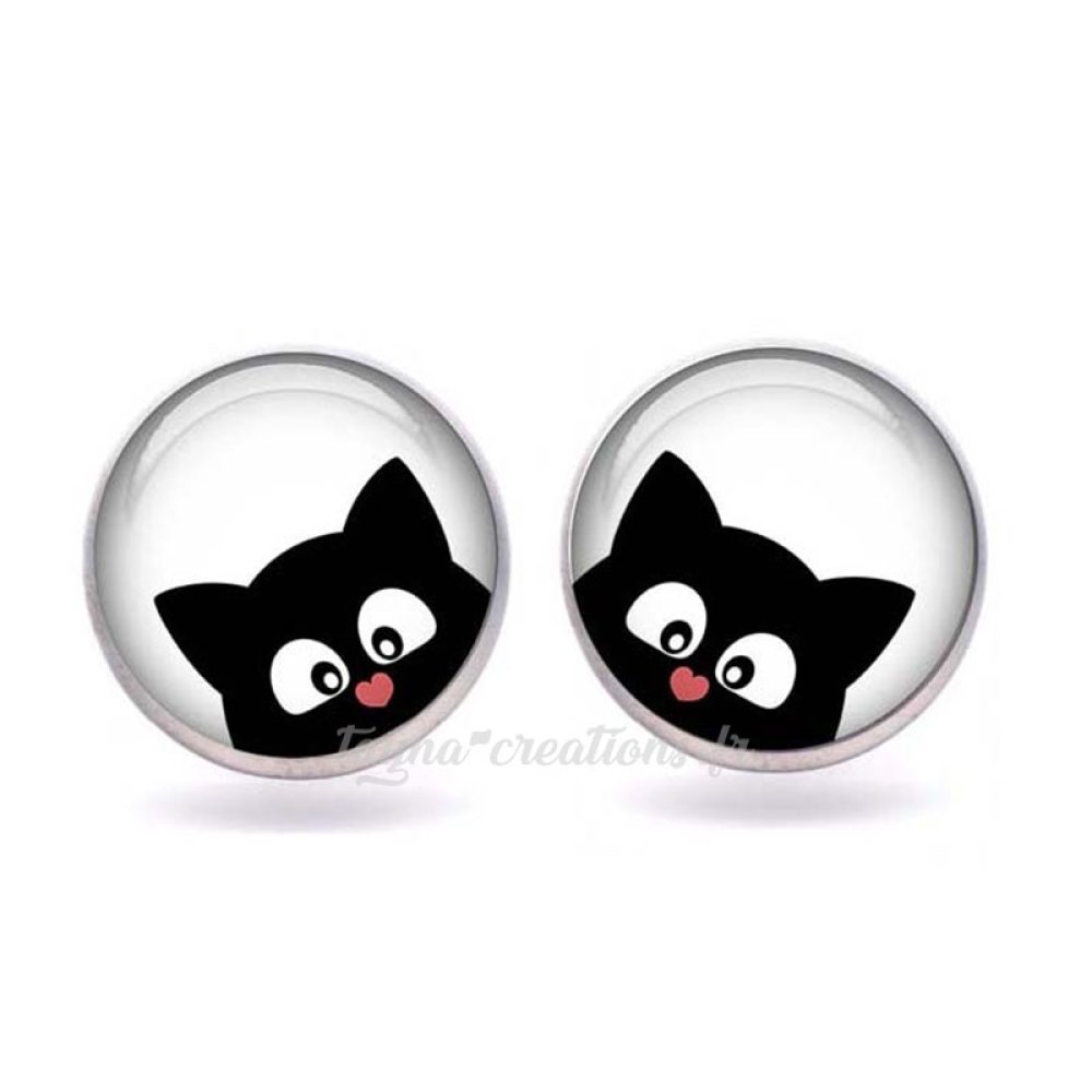 Puce d’oreille les 3 chats, boucle d'oreille chat noir, cabochon verre 12 mm Ajout au panier
