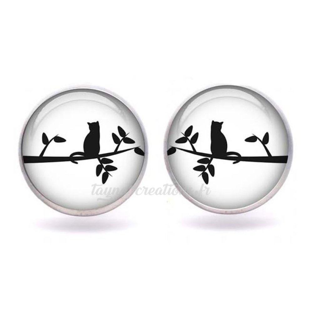 Puce d’oreille chat, boucle d'oreille chat sur branche, cabochon verre 12 mm