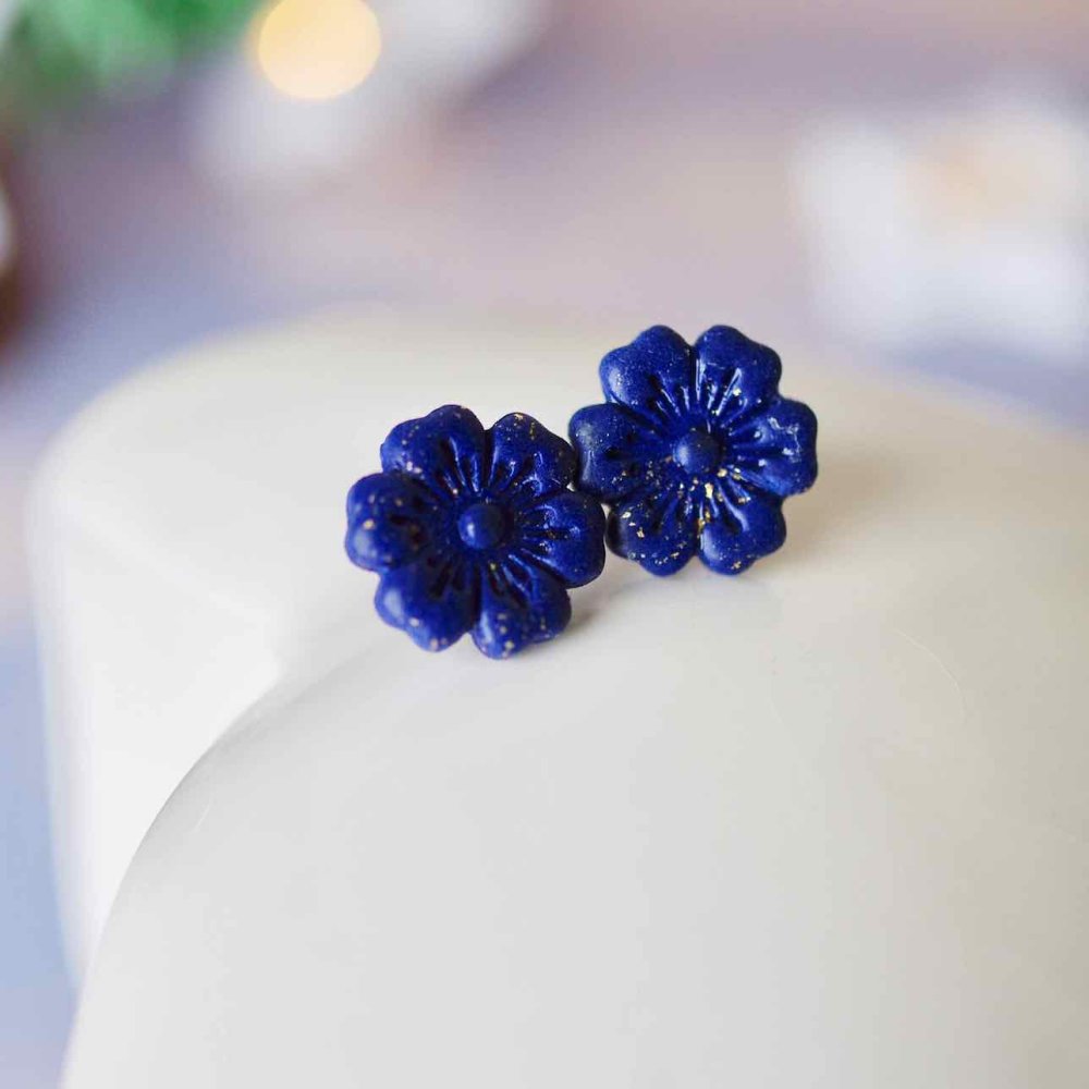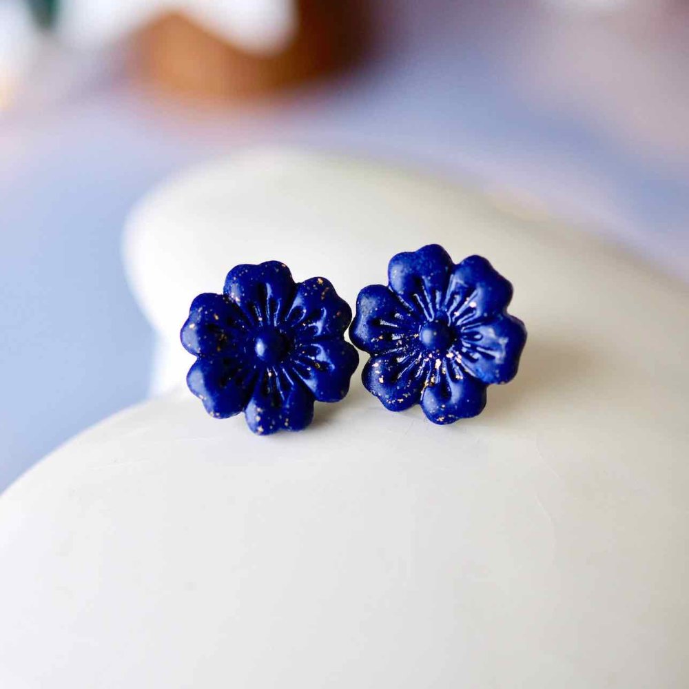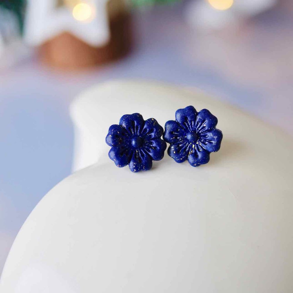 Puces d’oreilles artisanales en forme de fleur de cerisier, réalisées en polymère bleu nuit aux reflets dorés