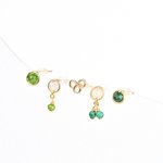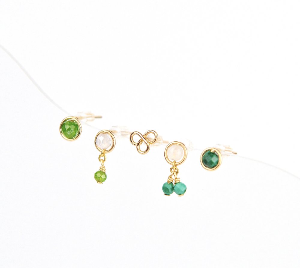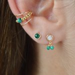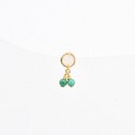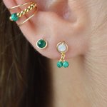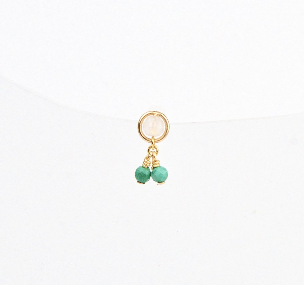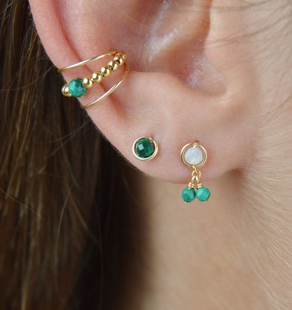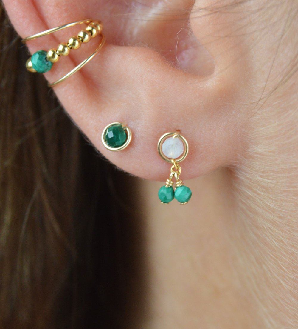 Discrètes et minimalistes, les puces Moon sont entièrement faites à la main au fil d'or laminé. Elles sont serties d'une petite pierre de lune aux reflets irisés, et ornées de petits grelots en malachite.