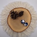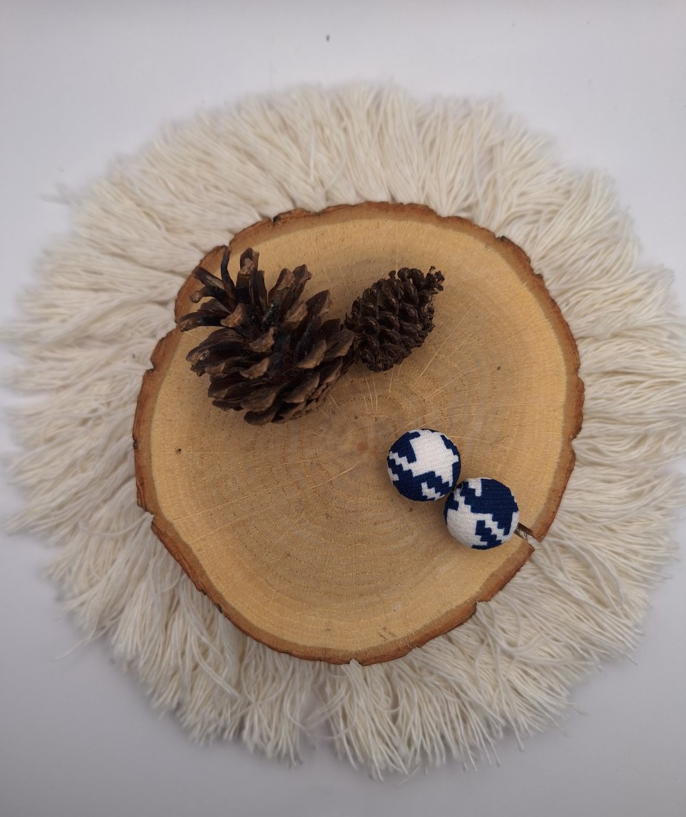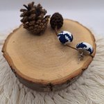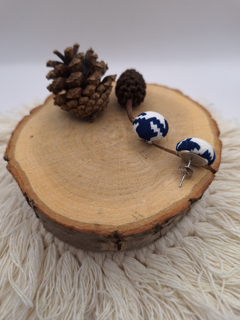 Puces d'oreilles tige et fermoir papillon, cabochon tissu bleu et blanc motif géométrique