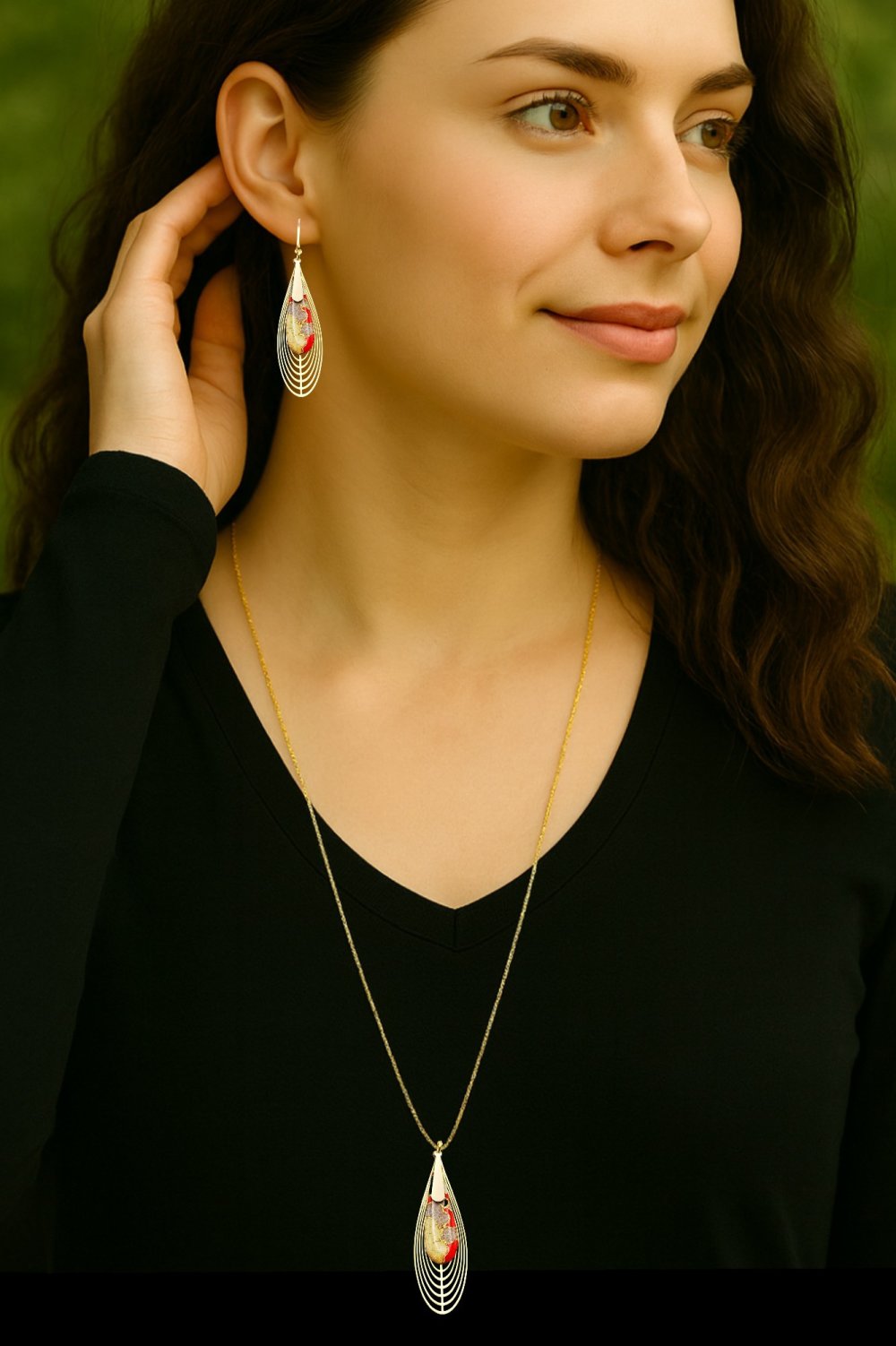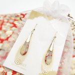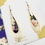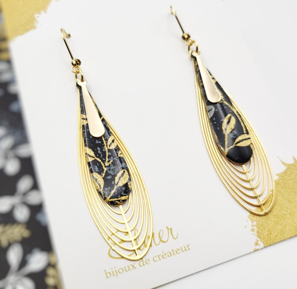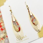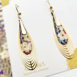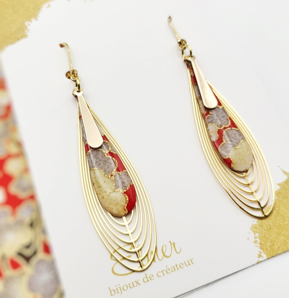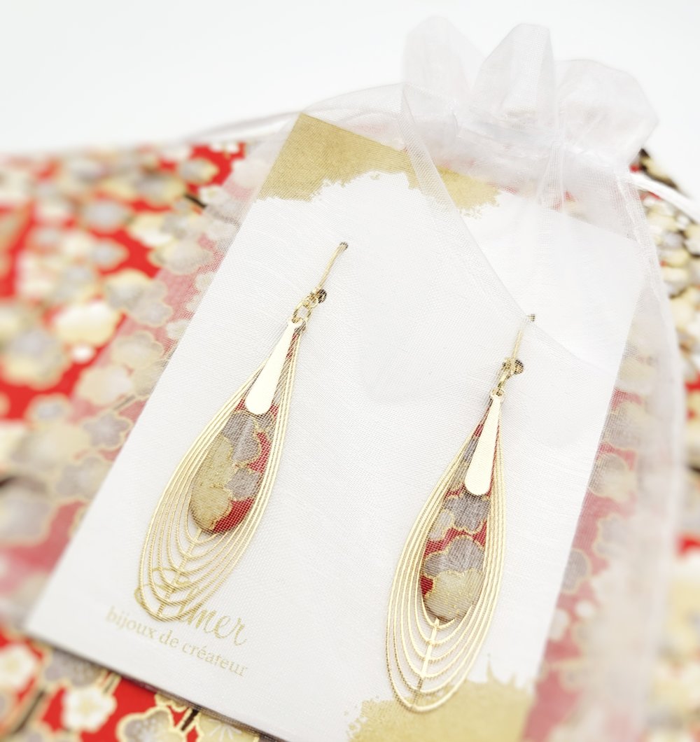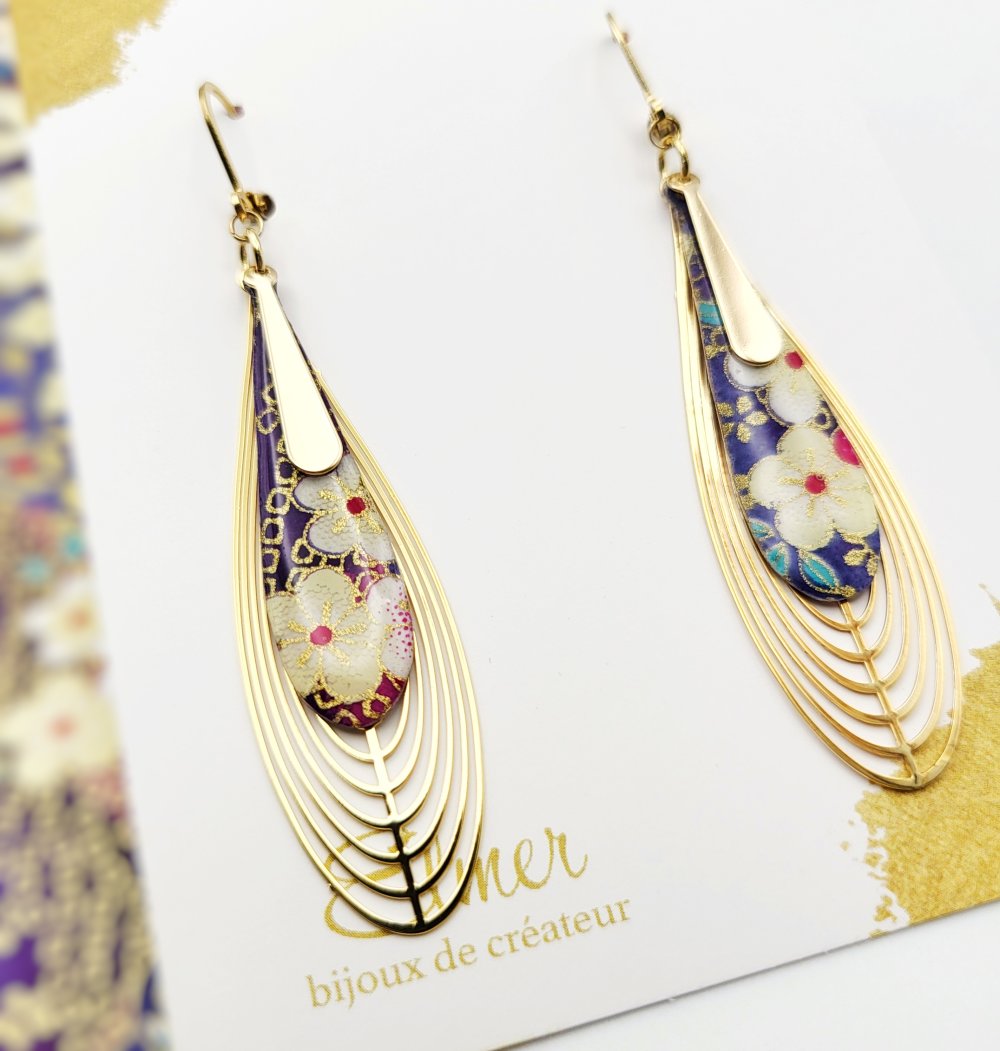 Elles associent une pampille en forme de goutte allongée recouverte de papier washi japonais et protégée par une fine résine, à une pampille dorée filigranée qui apporte éclat et finesse.