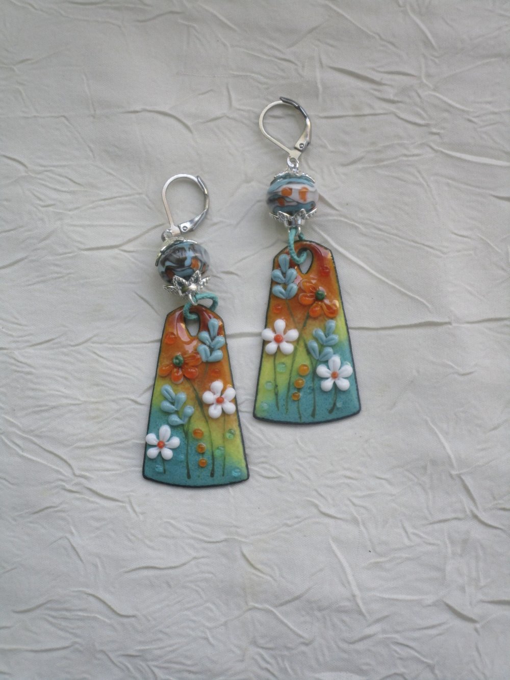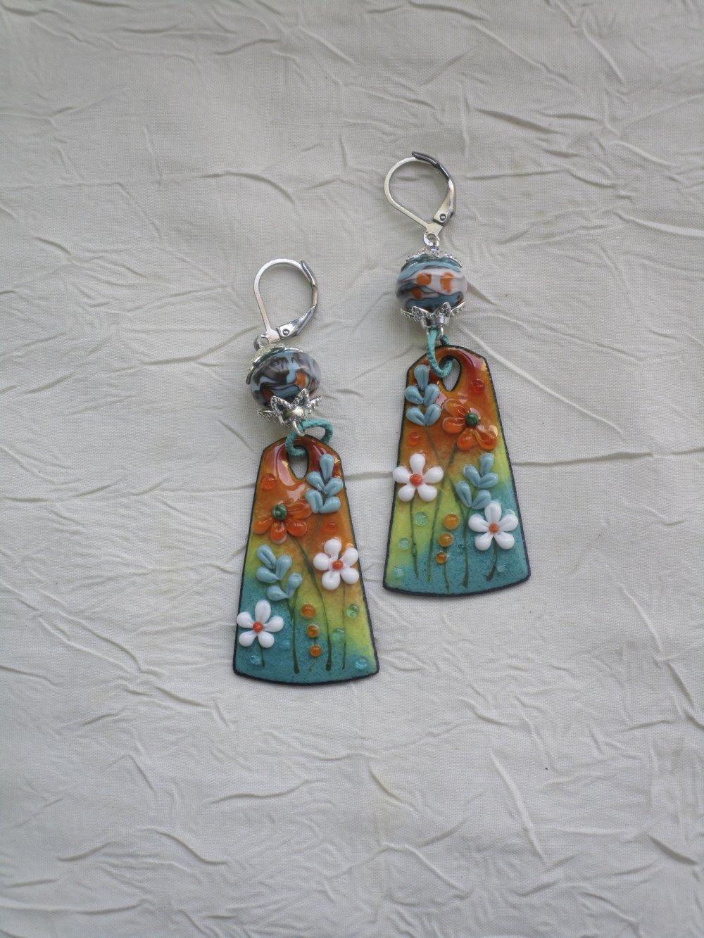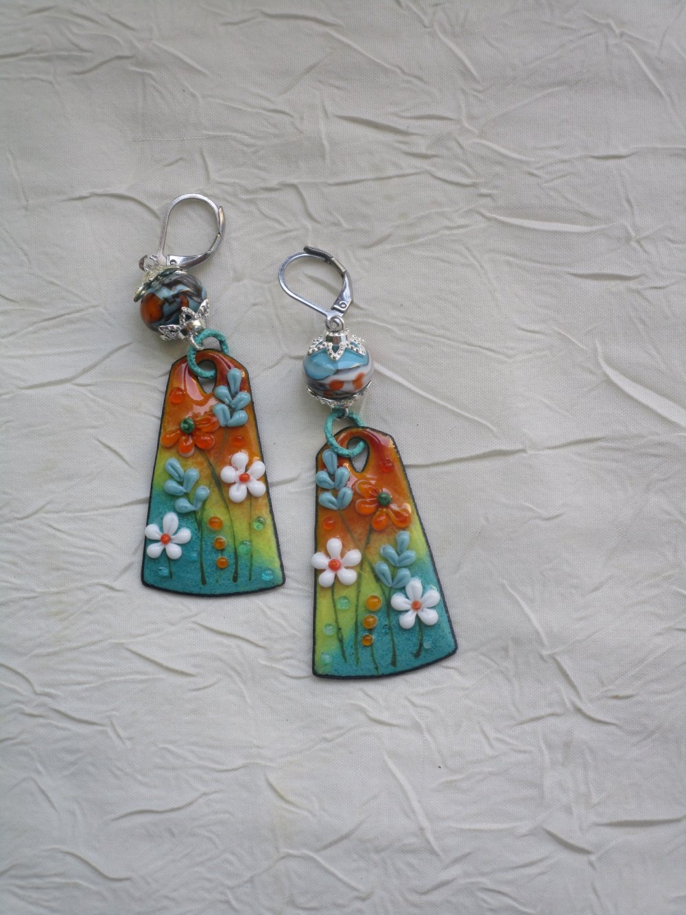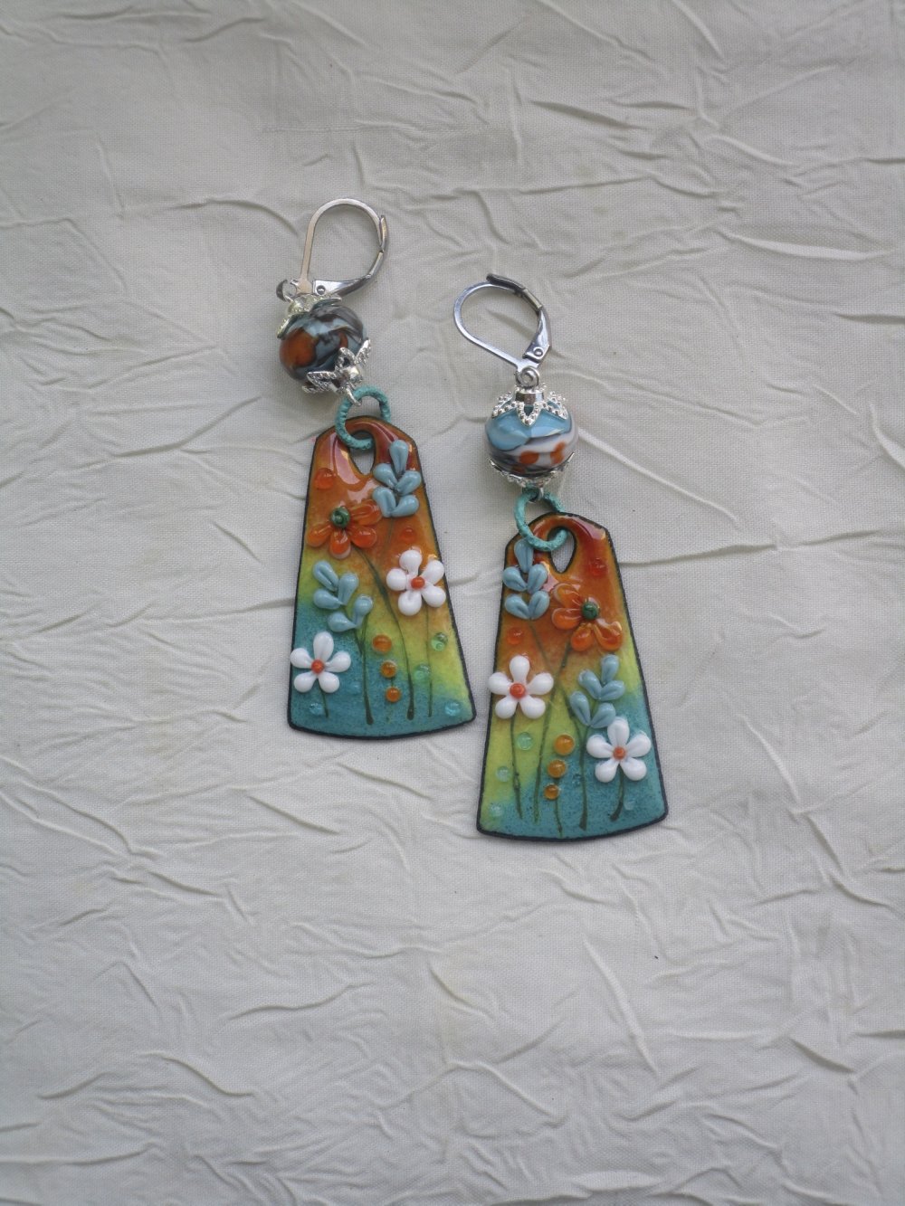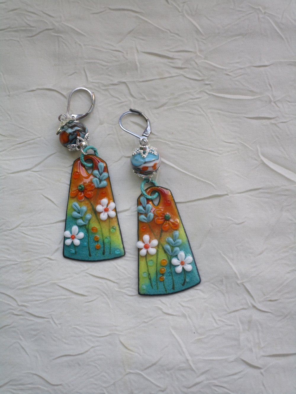 Délicate et ravissante paire de boucles d’oreilles composées de charms en cuivre émaillé, d’une perle de Murano de Créatrice montées sur dormeuses en métal argenté à l’aide d’accessoires en métal argenté