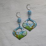 Délicate et ravissante paire de boucles d’oreilles composées de charms en cuivre émaillé, d’une perle de Murano de Créatrice montées sur dormeuses en métal argenté à l’aide d’accessoires en métal argenté