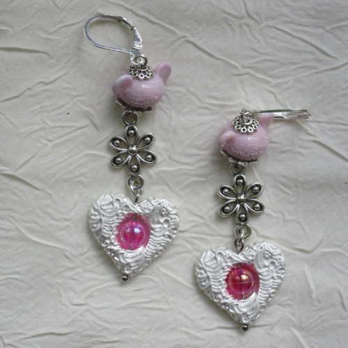 Charmante paire de boucles d’oreilles composées de cœur laqués blanc et d’une perle en verre de Murano d’une Créatrice, montées sur dormeuses en métal argenté à l’aide d’accessoires en métal argenté