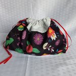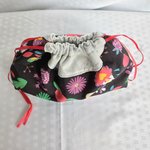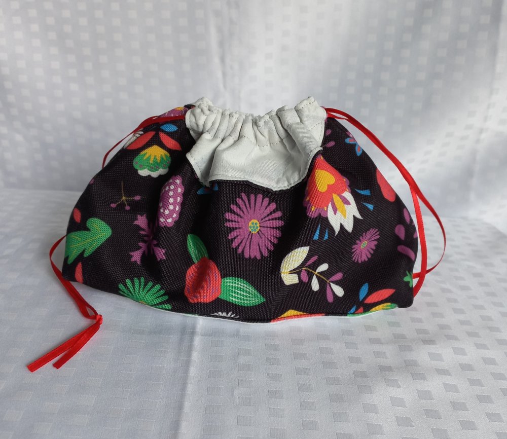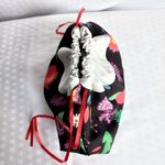 bourse à bijoux en tissus fond noir ,fleuri multicolore et satin blanc a motifs géométriques, se ferme avec des rubans rouges,