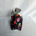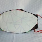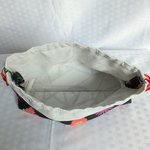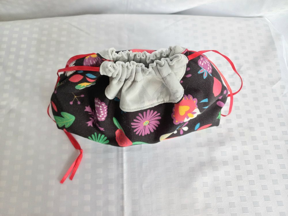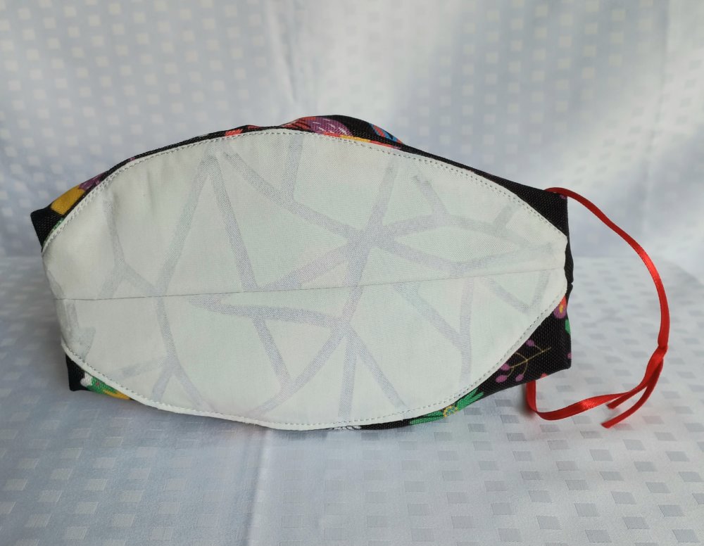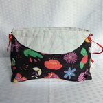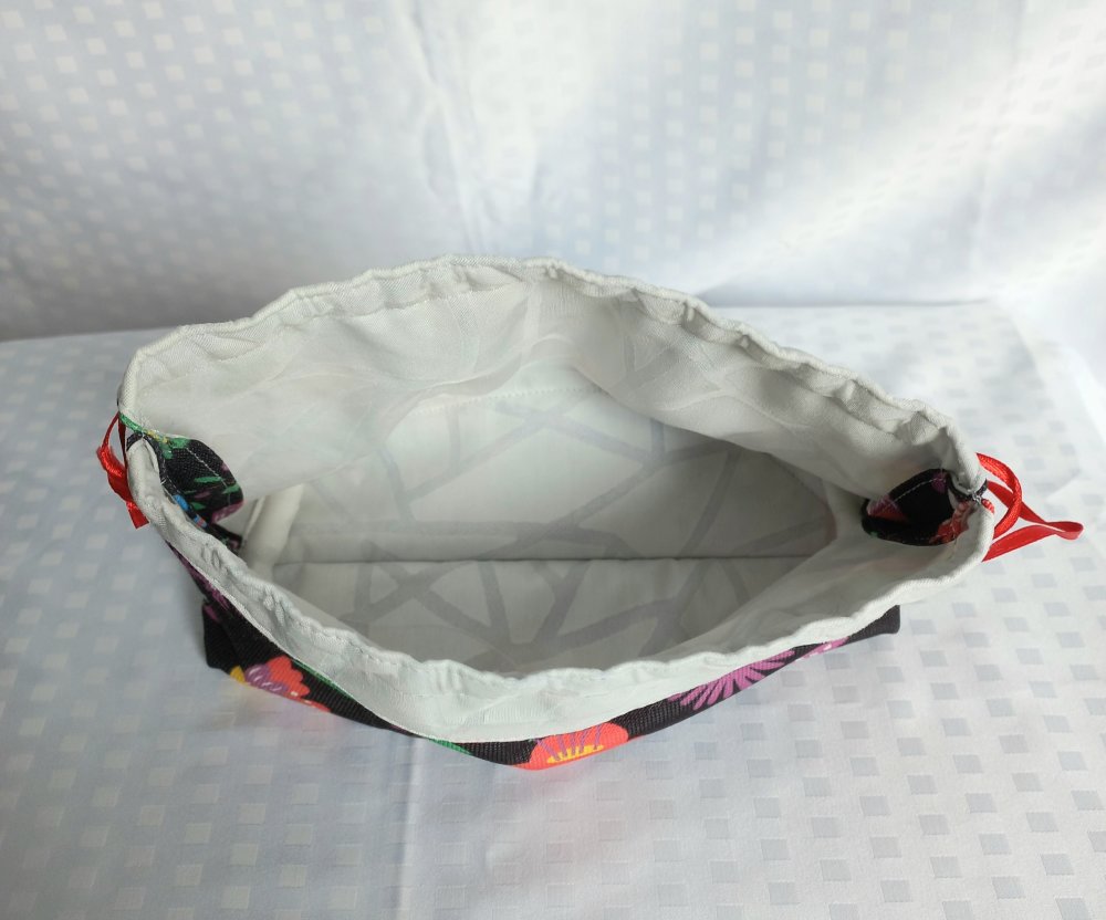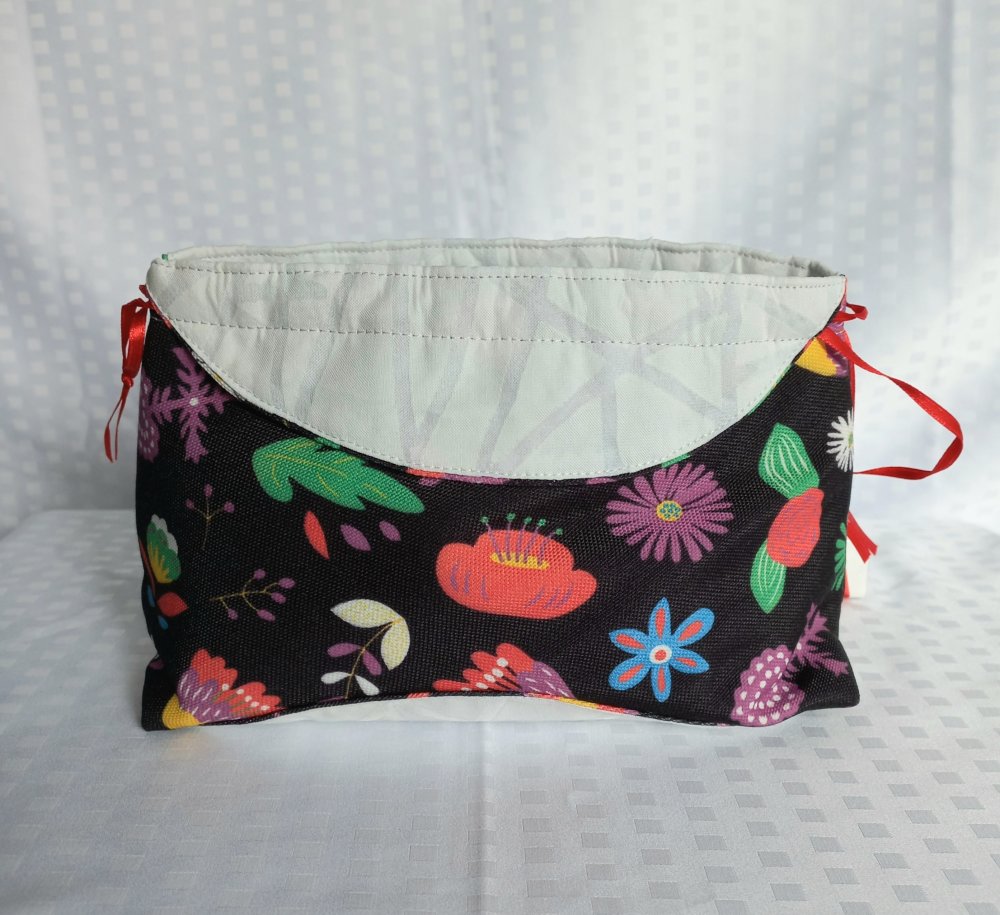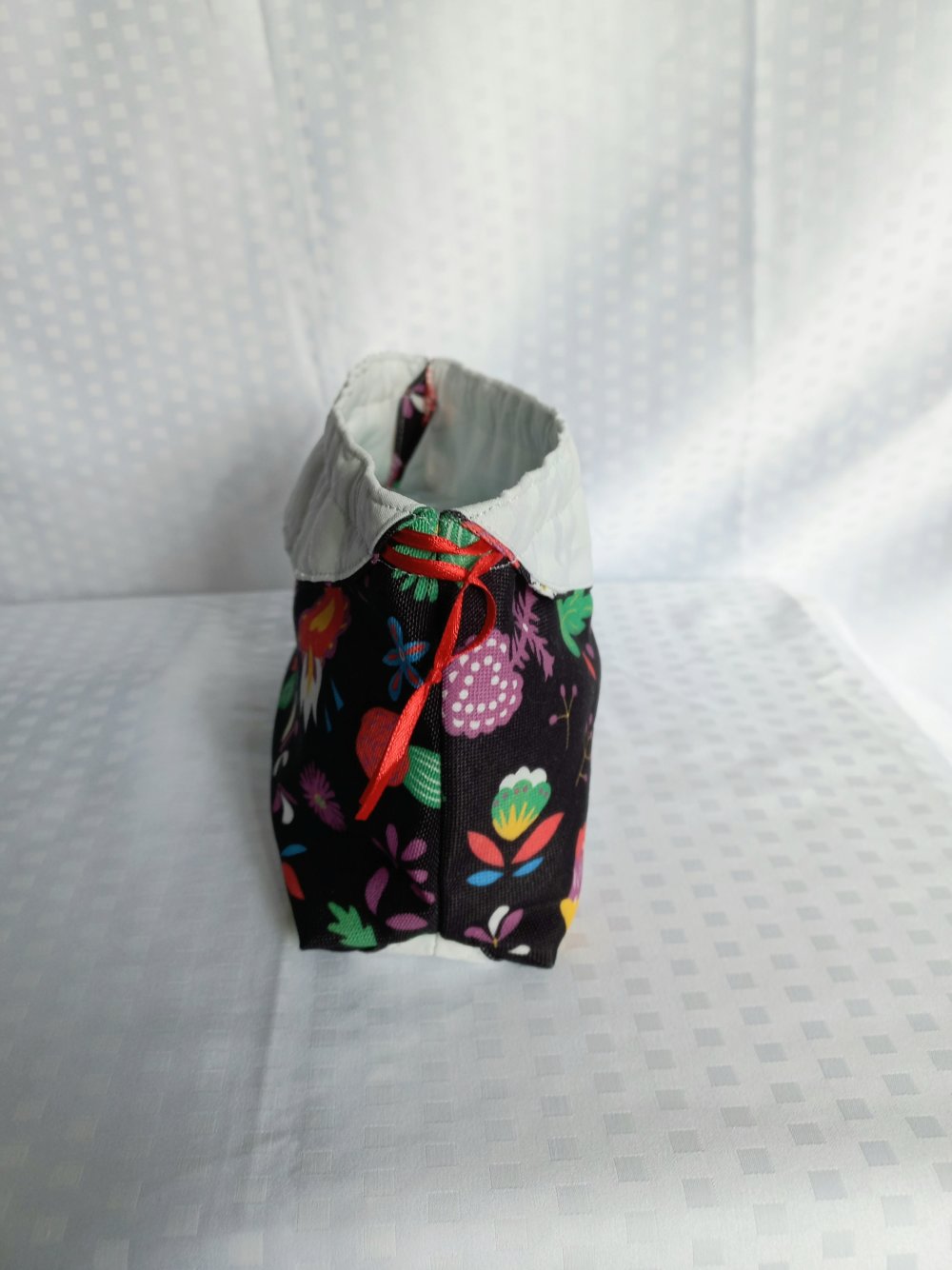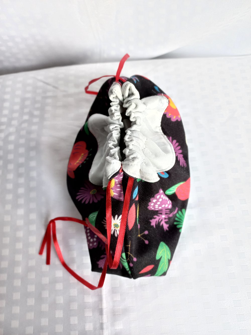 en tissu noir, fleuri multicolore et satin blanc a motifs géométriques, se ferme par liens coulissants avec des rubans rouges ,