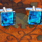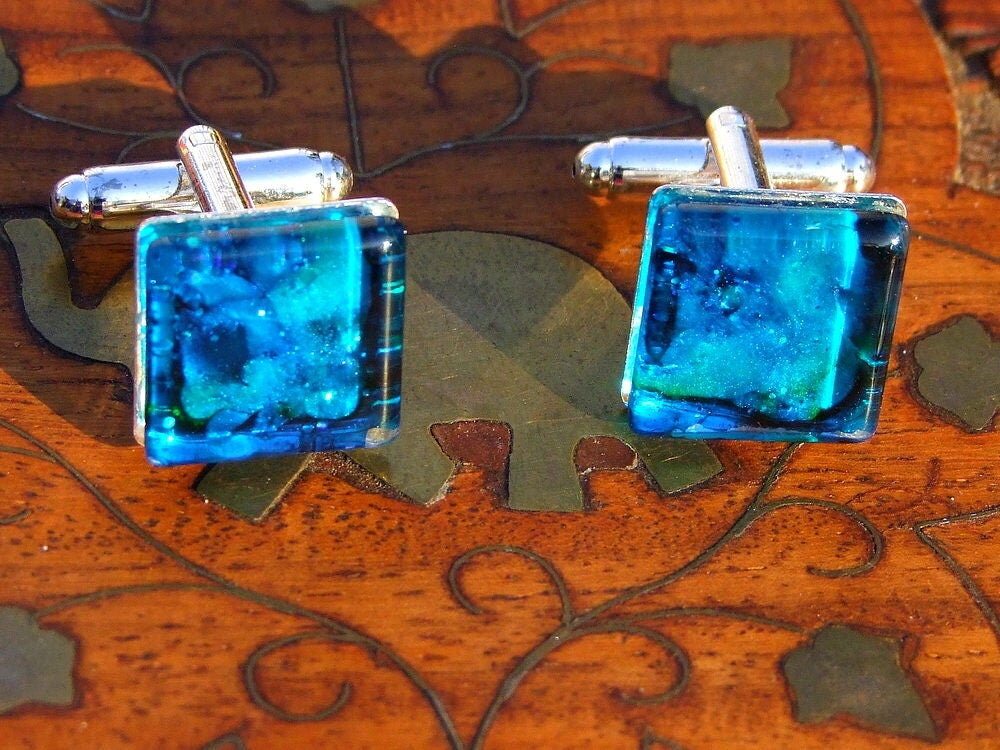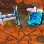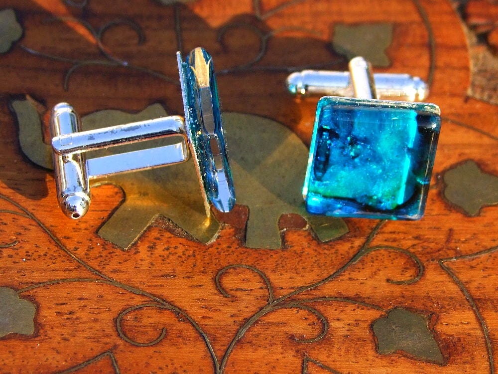 Boutons de manchettes Design Chic, Cabochons Carrés en Verre Coloration Artisanale Multicolore Baptisé Bleu Lagon Modèle Unique