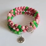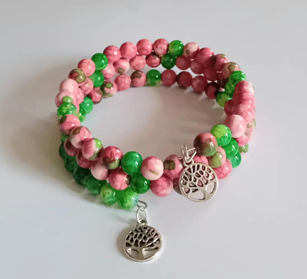 Ce bracelet artisanal est composé de trois rangs de perles aux couleurs douces et naturelles, mêlant rose et vert avec de jolis effets marbrés. Deux breloques Arbre de Vie apportent une touche symbolique et élégante. Léger, confortable et facile à porter, il s’adapte à tous les poignets grâce à son montage élastique.