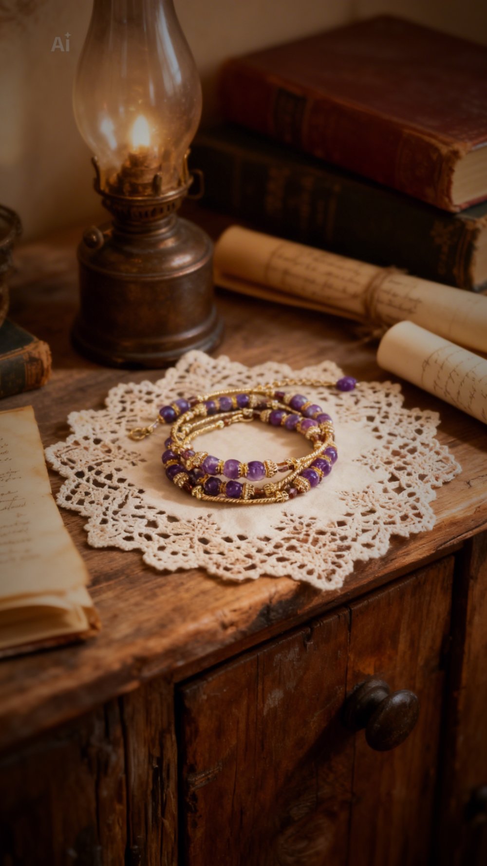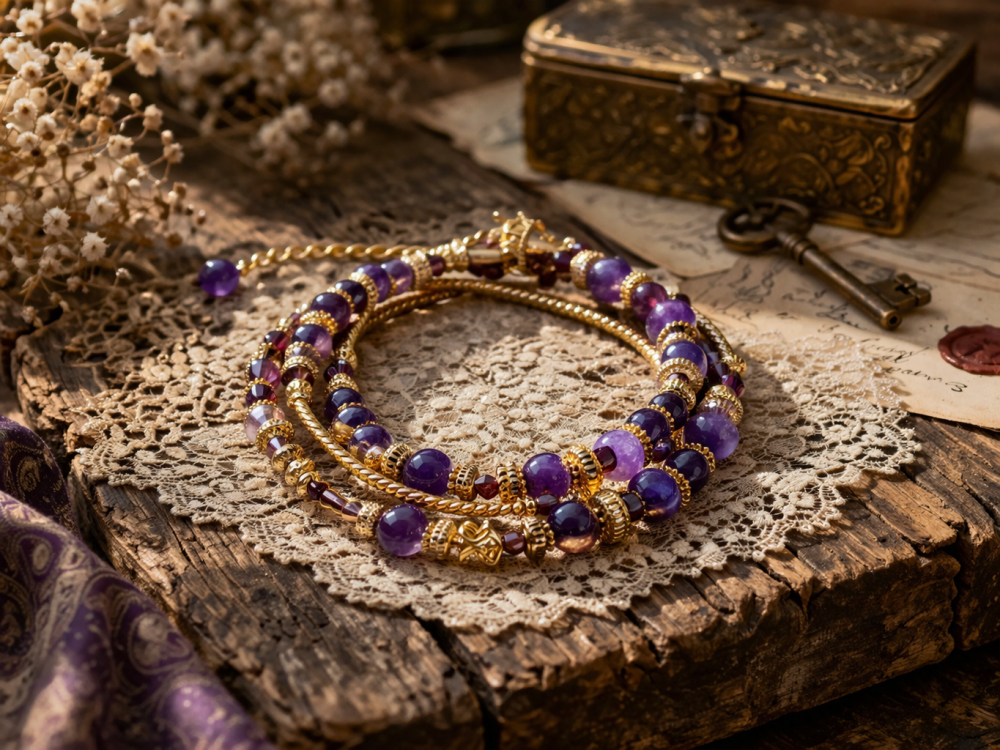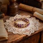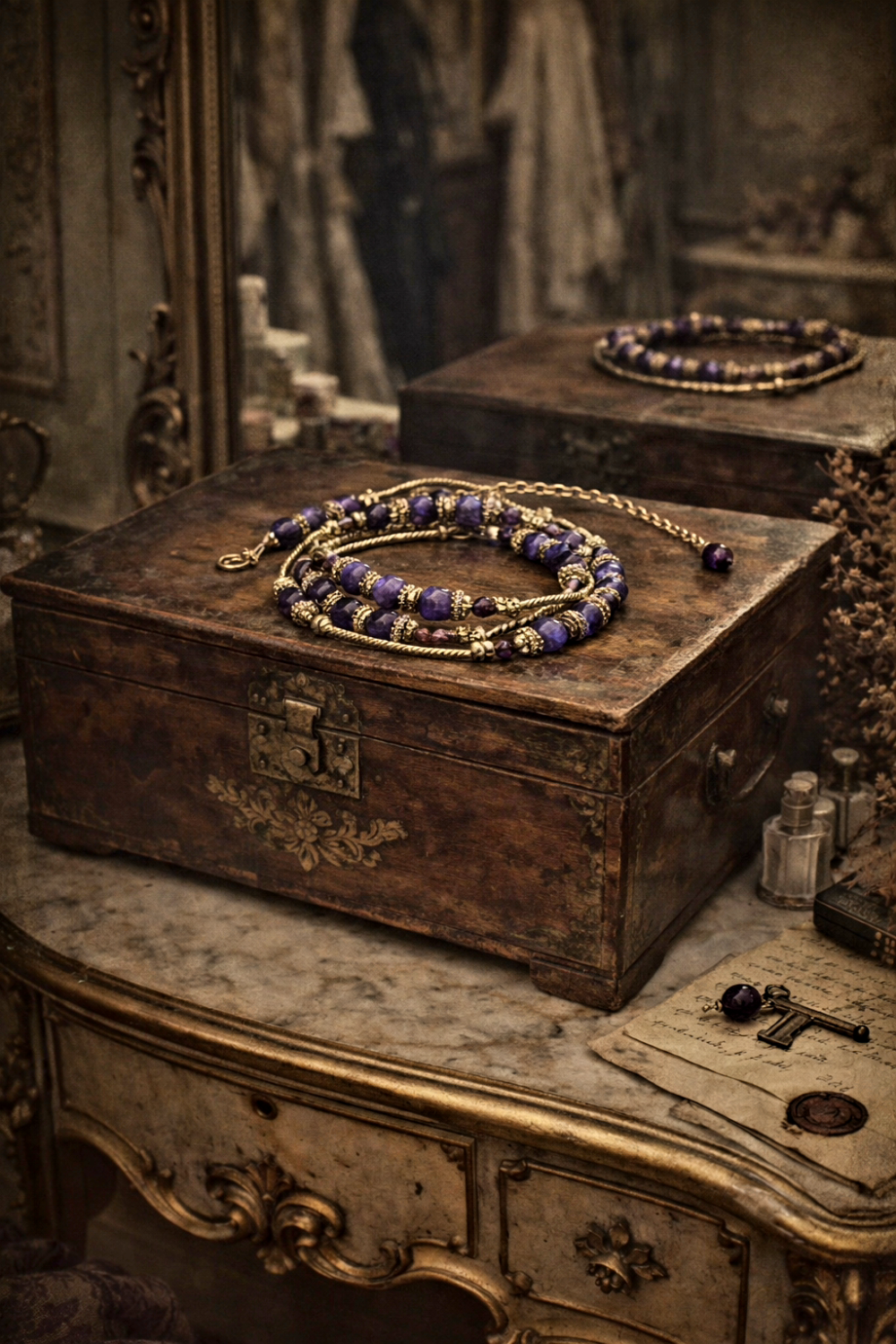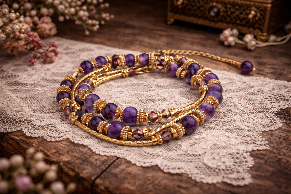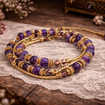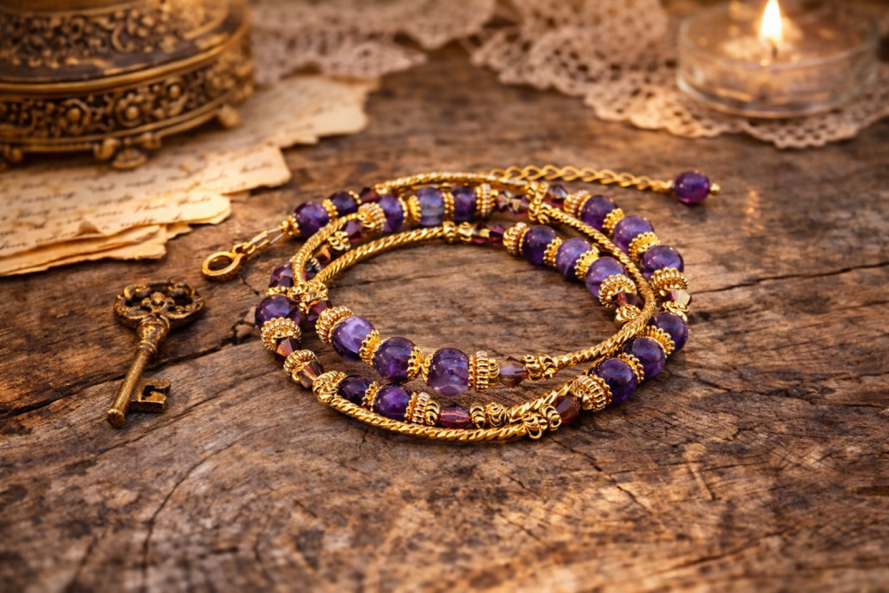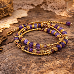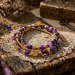 Triple wrap bracelet made with gold stainless steel charms and real purple amethyst beads.