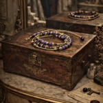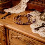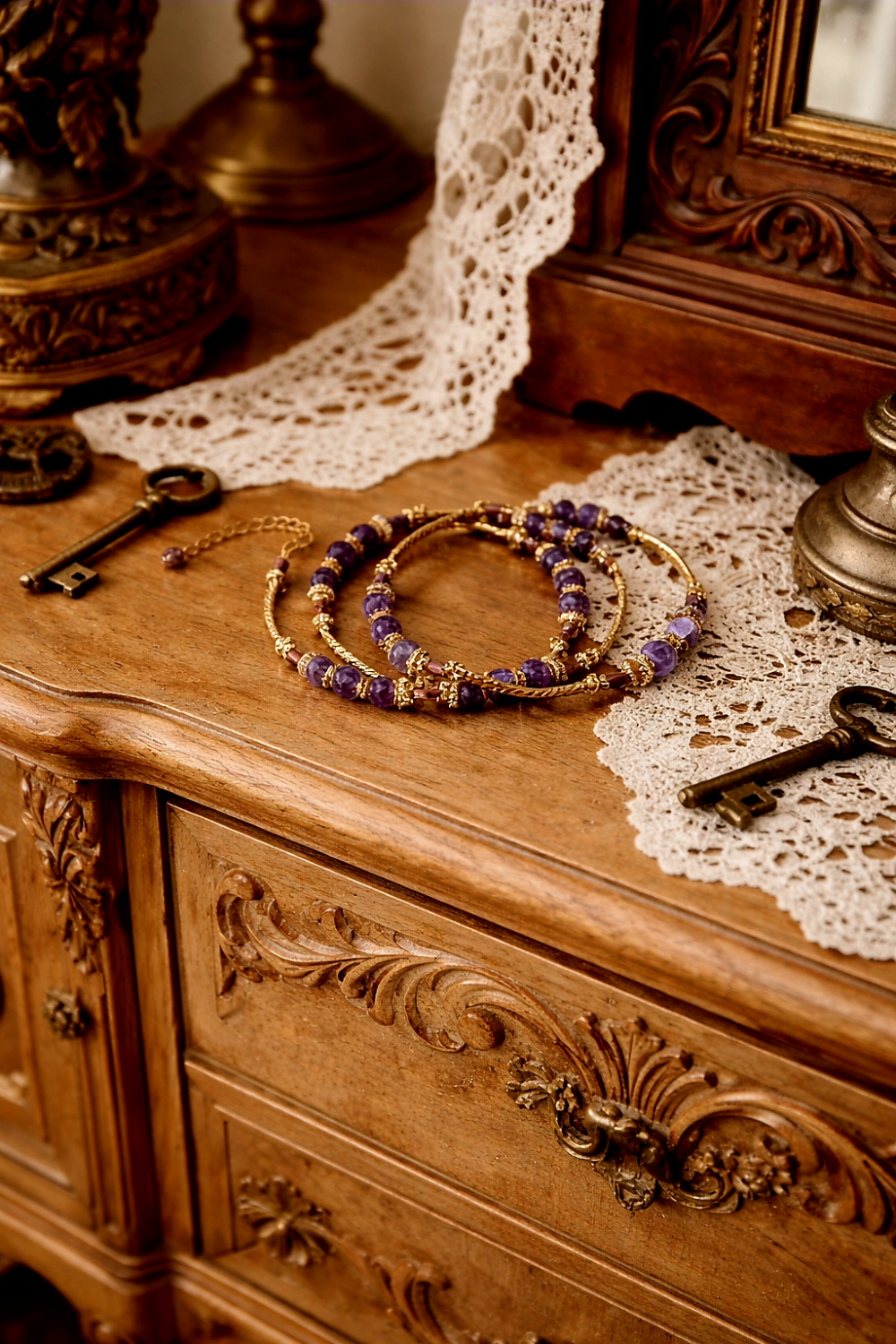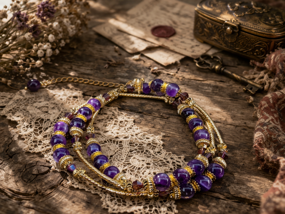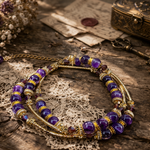 Bracelet triple tour fait que avec des breloques dorées en acier inoxydable et de véritables perles violettes en améthyste.