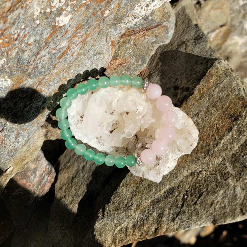 Le Quartz Rose est connu pour être l'une des pierres symbolisant l'amour inconditionnel et la paix infinie, c'est le cristal le plus important pour le cœur et le chakra du cœur, qui enseigne la véritable essence de l'amour.Elle purifie et ouvre le cœur sur tous les plans, apporte une profonde guérison intérieure et l'amour de soi. Calmant et rassurant, ce cristal est excellent en cas de traumatisme ou de crise.Le Quartz Rose absorbe en douceur l'énergie négative et la remplace par de vibrations affectueuses. Il intensifie l'empathie et la sensibilité, favorisant l'acceptation du changement nécessaire.Apaise la douleur intériorisée et soigne la carence affective. Si on n'a jamais reçu de l'amour, ce cristal rend le cœur réceptif. Si on a aimé et perdu cet amour-là, la Quartz Rose atténue le chagrin.Il favorise le pardon de soi et l'acceptation, appelle la confiance en soi et la conscience de sa propre valeur.C'est une pierre qui permet d'éliminer les blessures affectives les plus douloureuses.Le Quartz Rose stimule l'amitié et apporte la paix, le respect de soi et favorise le pardon. C'est une pierre très utile en cas de dépression et favoriserait la cicatrisation des plaies.L'Aventurine est une pierre de tranquillité intérieure et de sang-froid. Elle a un effet anti-stress. Elle vous donnera de l'humour, de la gaieté et procure patience et tolérance. Elle vous aidera à régler vos problèmes émotionnels.Sur le plan psychologique, l'Aventurine affermit les qualités de leader et le caractère décidé. Favorise la compassion et l'empathie, encourage la persévérance. Elle vous donne de nouvelles idées, de nouveaux concepts, de l'autonomie et de l'enthousiasme.Elle calmera votre colère et votre irritation, stimule le rétablissement émotionnel, aide à vivre dans son cœur et renforcera votre self-control (contrôle de soi).L'Aventurine est une pierre conseillée pour les enfants trop excités, elle aide à effectuer les bons choix, atténue le bégaiement et allège les névroses graves. Positive, elle est également considérée comme la pierre de la prospérité créative.