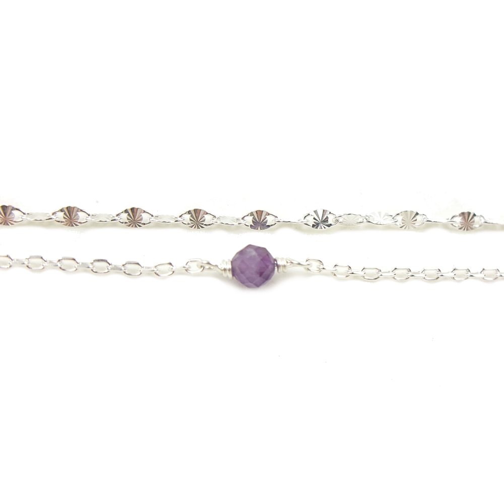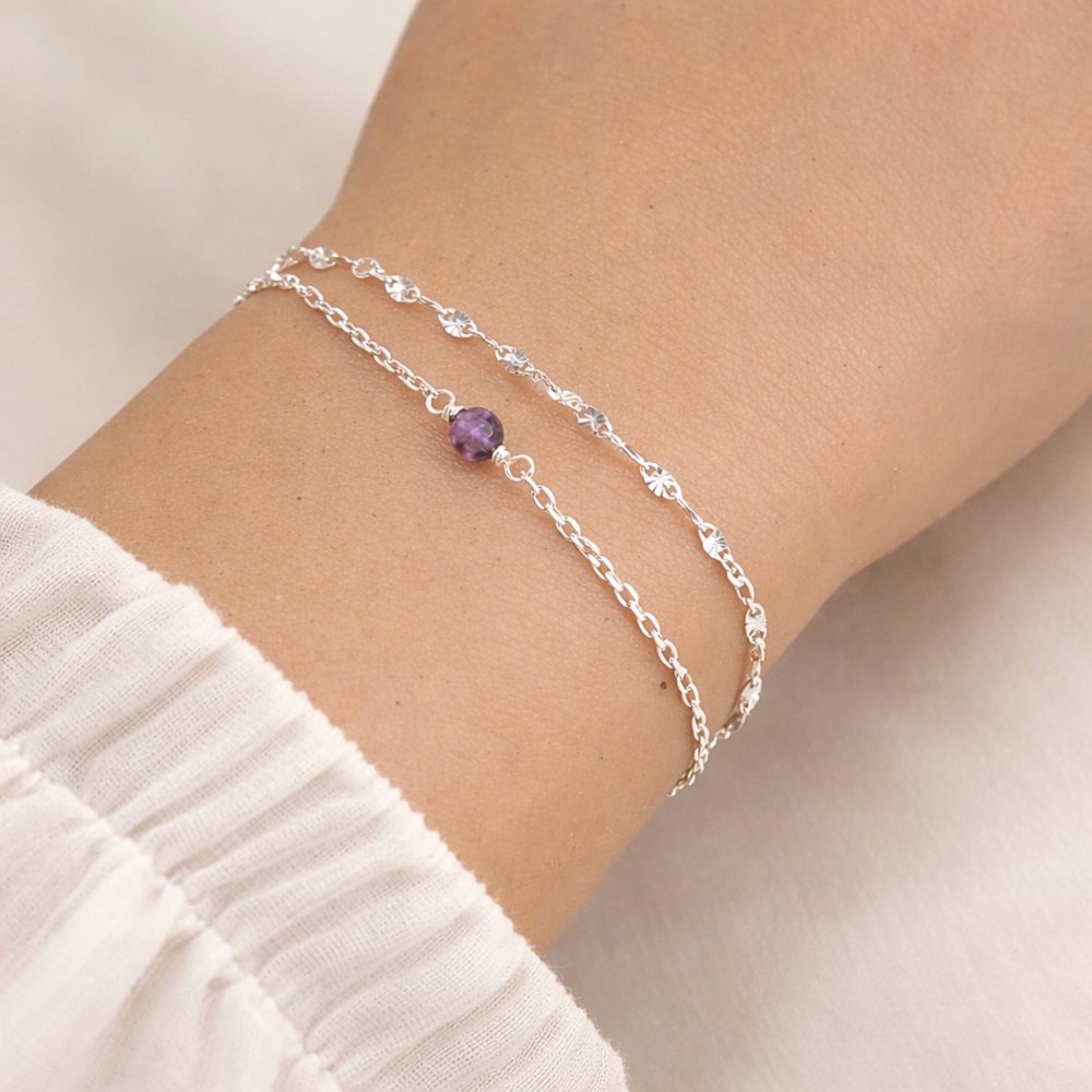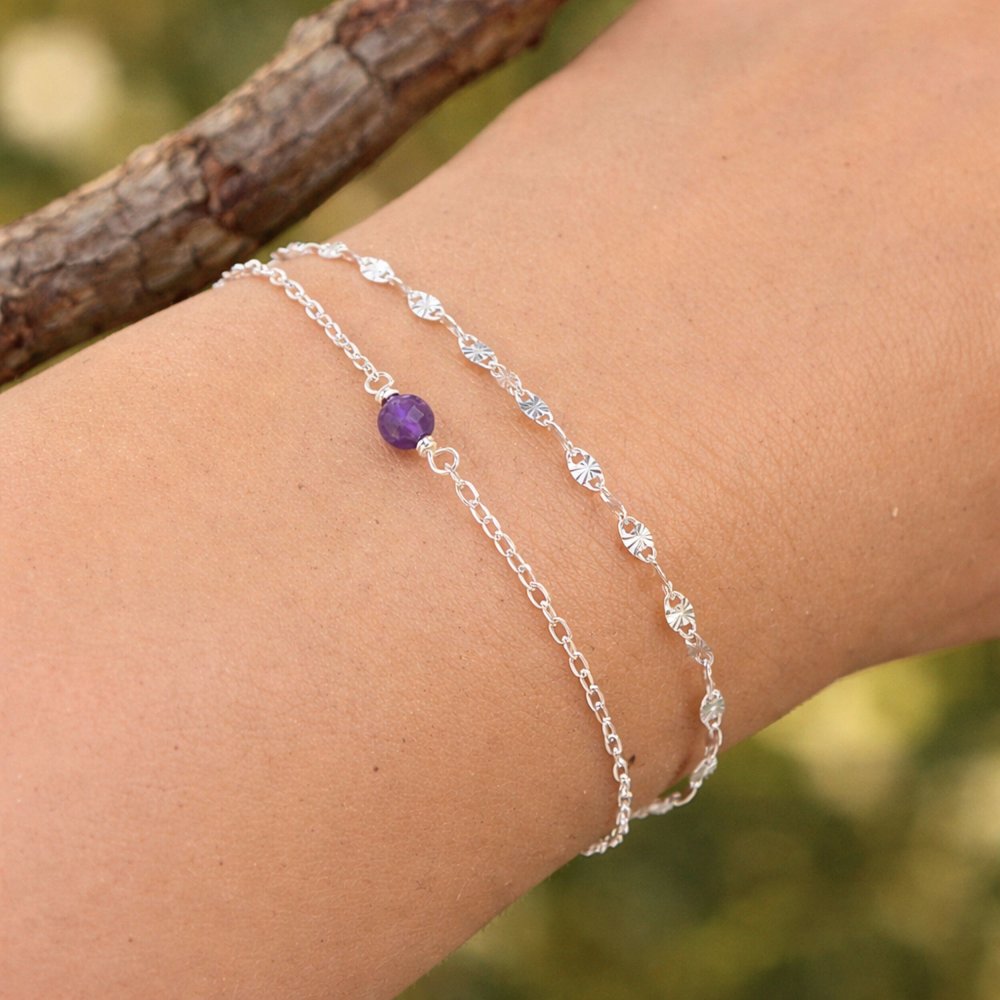 Ce bracelet en argent 925 réunit la douceur d’une améthyste facettée de 4 mm et la lumière d’une chaîne motif rayon de soleil. Pierre de naissance de février, l’améthyste est un symbole de sérénité, de protection...