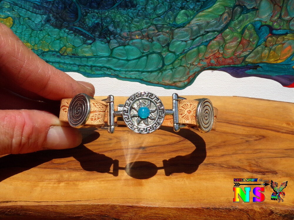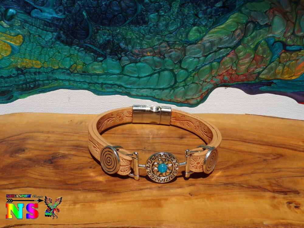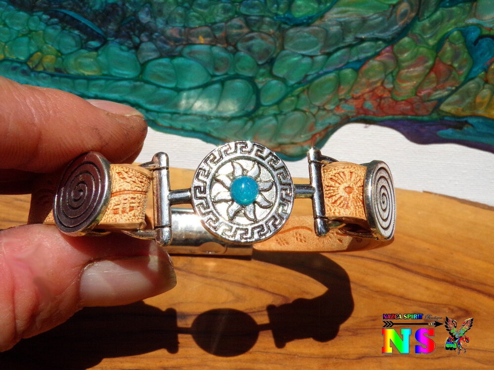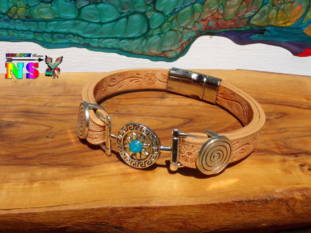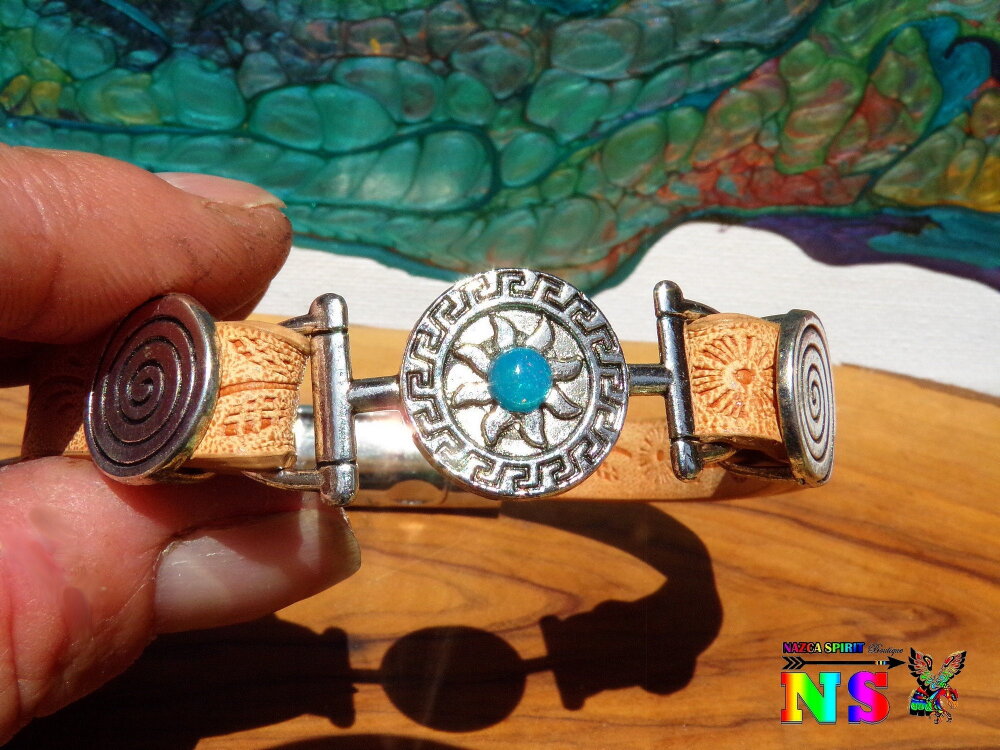 Bracelet Boho Ethnique Cuir Impression Fleurs Soleil Inca Plaqué Argent et Opale Bleue du Mexique - Bracelet Artisanal Fermoir Magnétique.