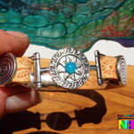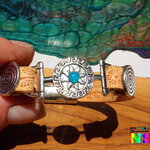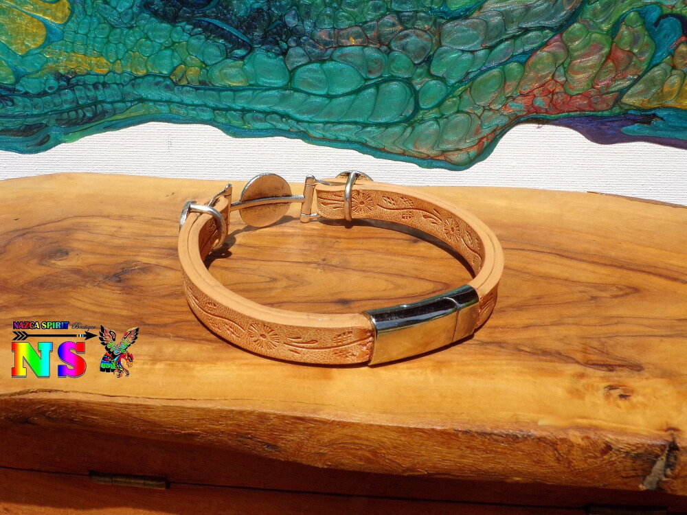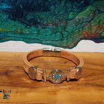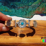 Je vous présente un superbe bracelet boho bohème ethnique réalisé intégralement à la main à partir d'une bande de cuir couleur beige imprimé de jolis motifs fleurs, de perles passant plaqué argent gravées d'un motif spirale amérindien, et d'un connecteur ethnique plaqué argent en forme de soleil inca gravé rehaussé par un joli cabochon rond en opale d'Ethiopie bleu turquoise iridescent.