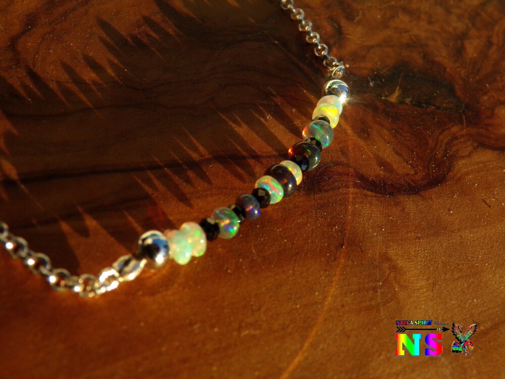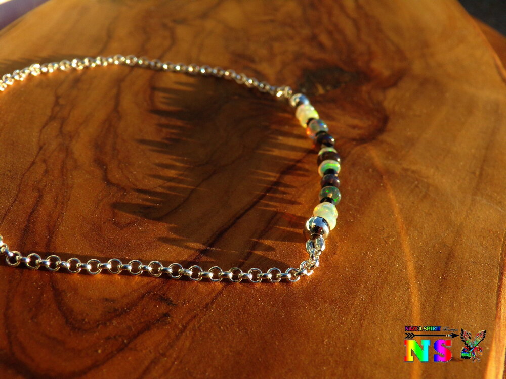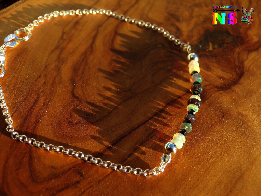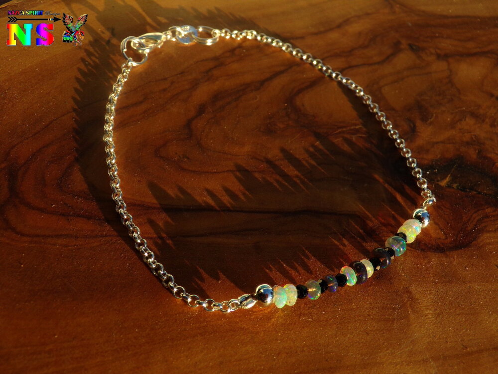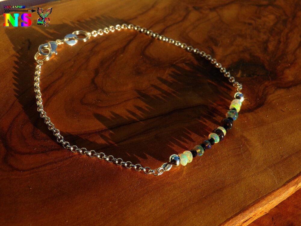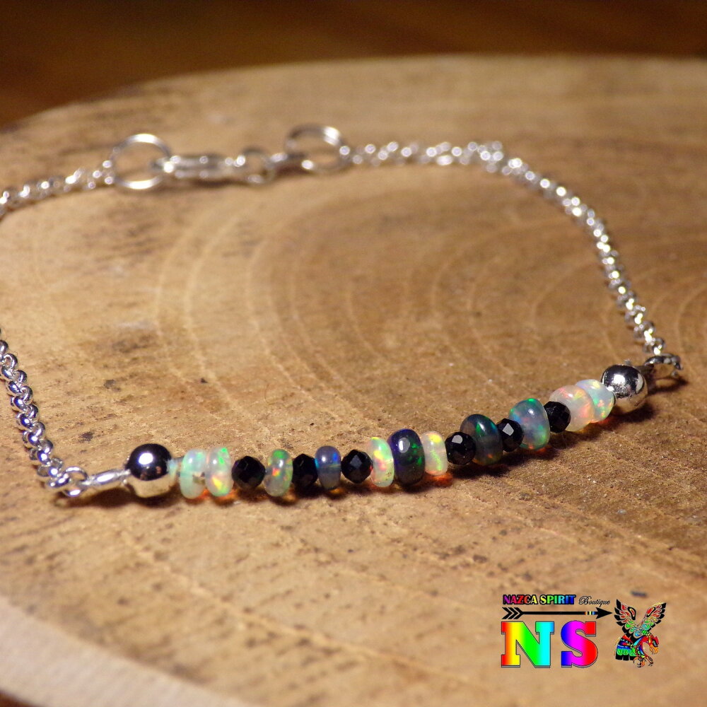 Superbe bracelet aux notes bohème réalisé à partir de chaîne en argent 925, de délicates perles d'opales blanches et noires d'Ethiopie iridescentes et de perles de spinelle noire.