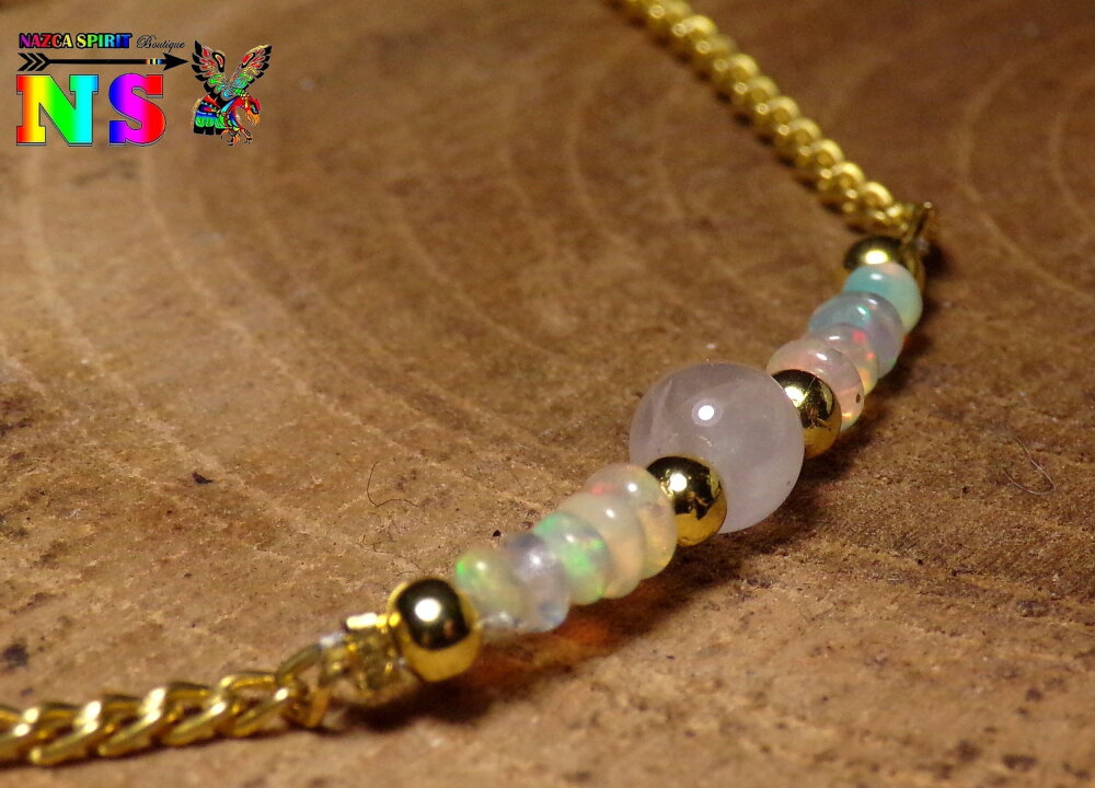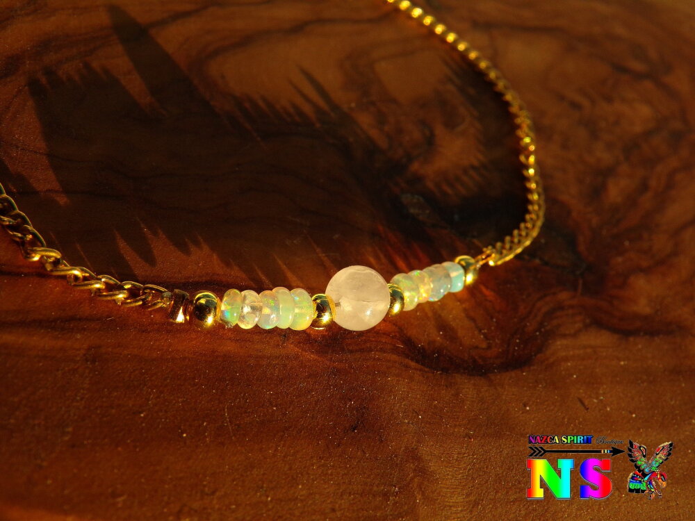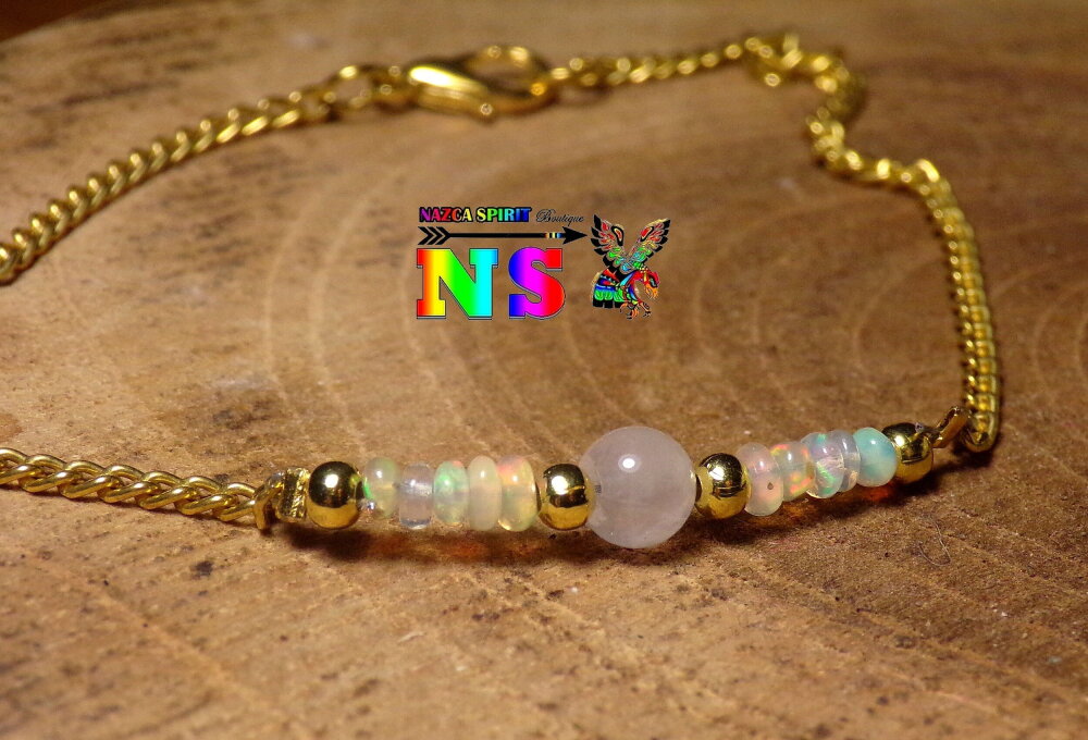 Bracelet Chaîne Plaqué Or et Opales Blanches Ethiopie - Bracelet Féminin Délicat en Pierres Précieuses - Bijou Bohème Français.