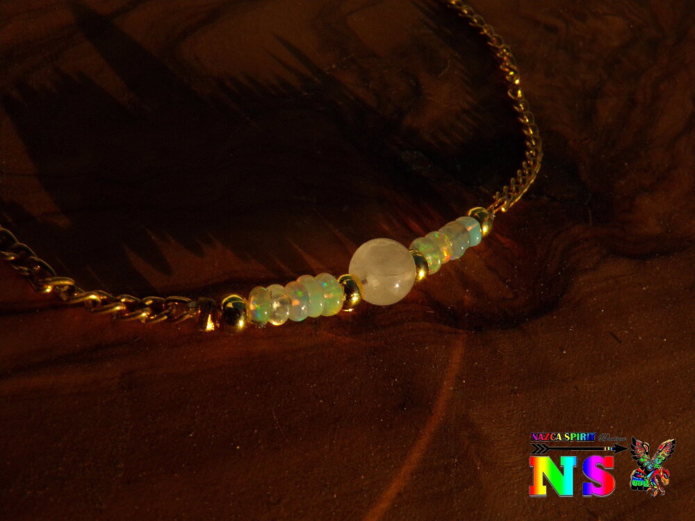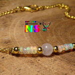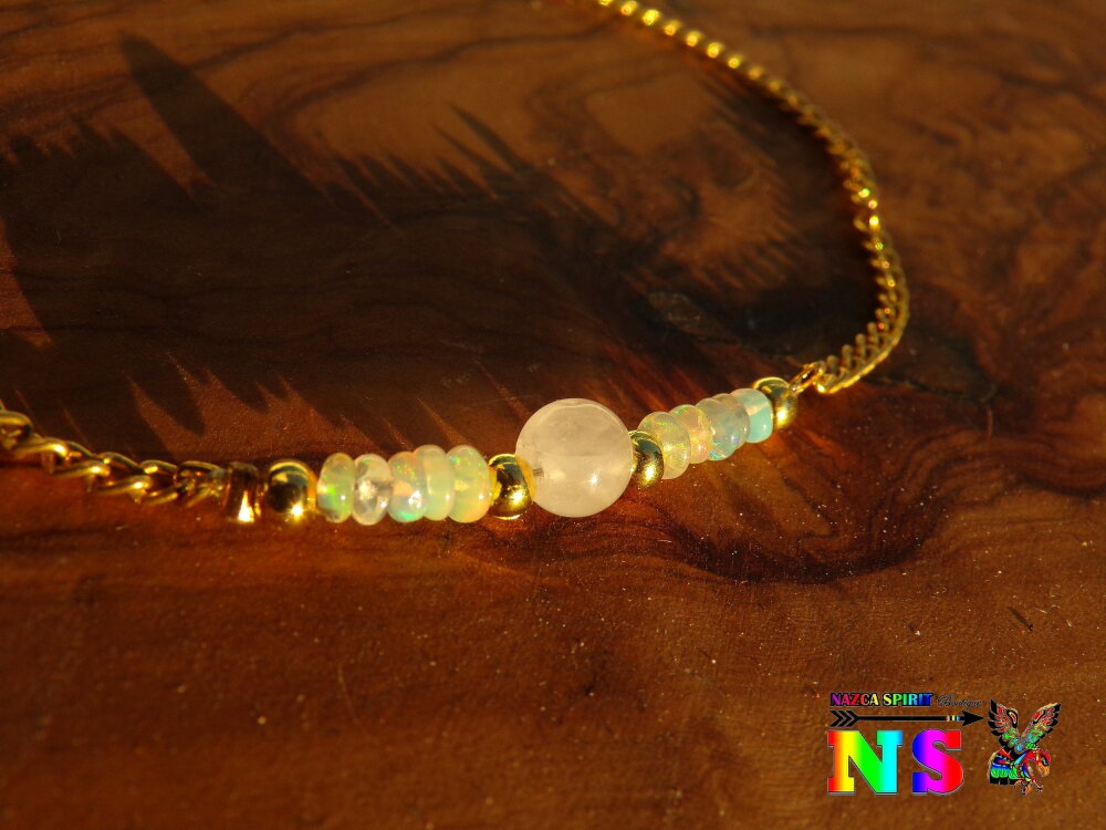 Superbe bracelet aux notes bohème réalisé à partir de chaîne en cuivre plaqué or, de perles rondelles en opales d'Ethiopie et d'1 perle ronde en cristal de roche.