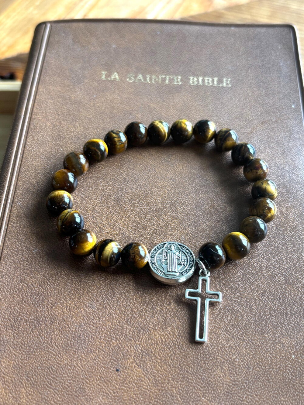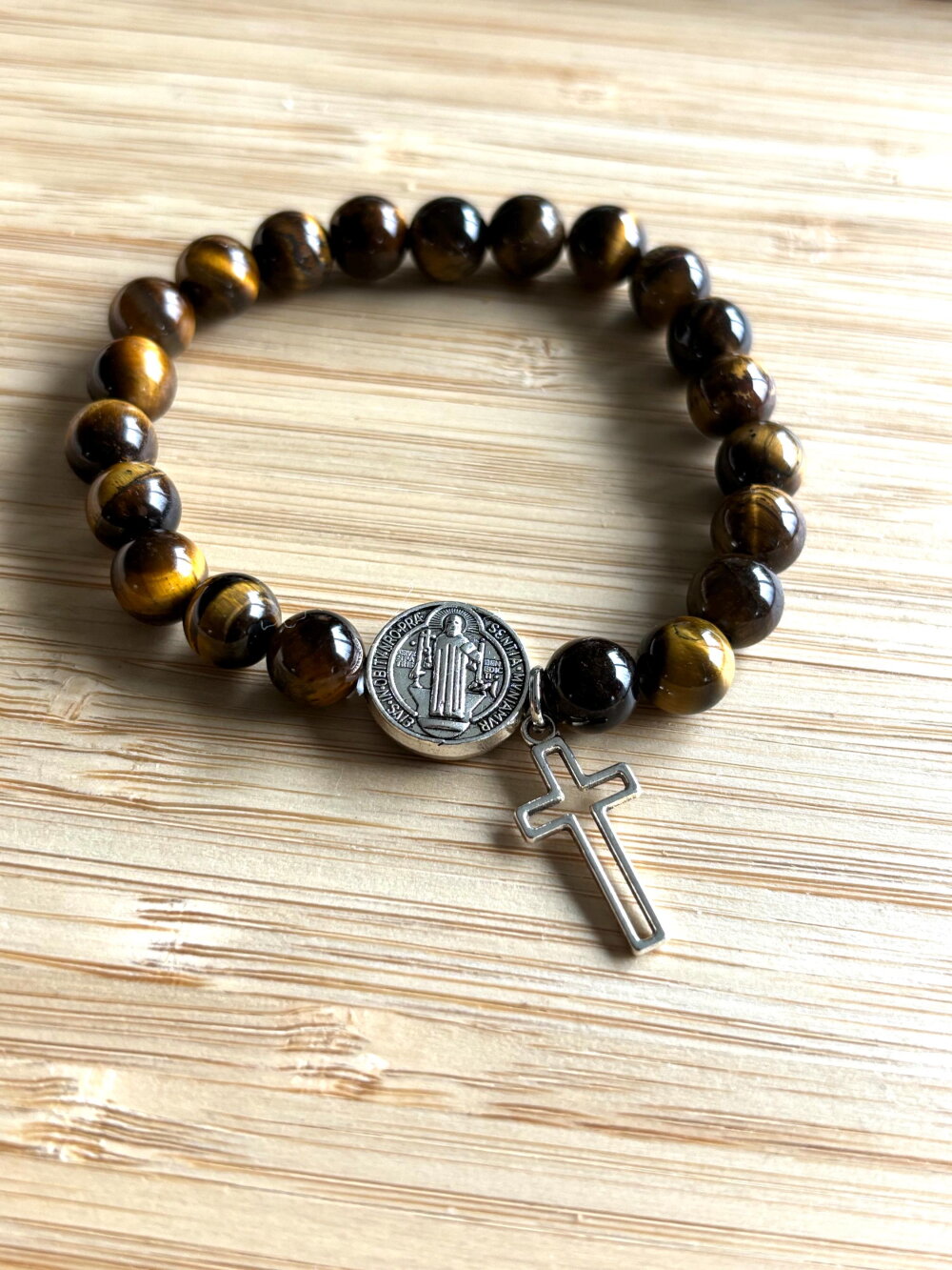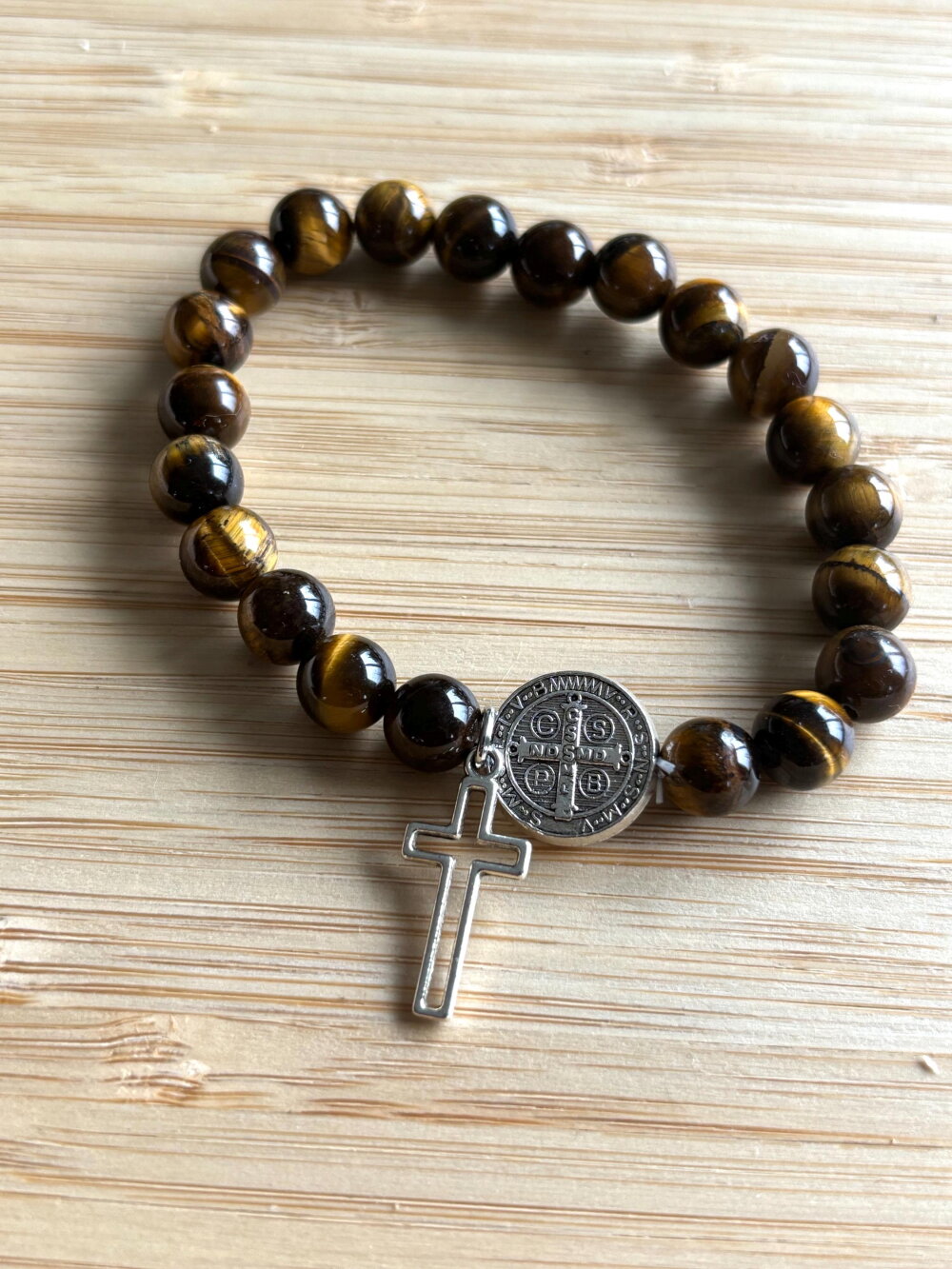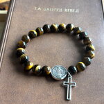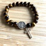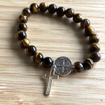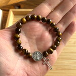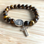 Bracelet chapelet Chrétien fait main composé de perles en pierre naturelle œil de tigre de 6 mm, et d’une perle médaille de Saint et sa croix.
