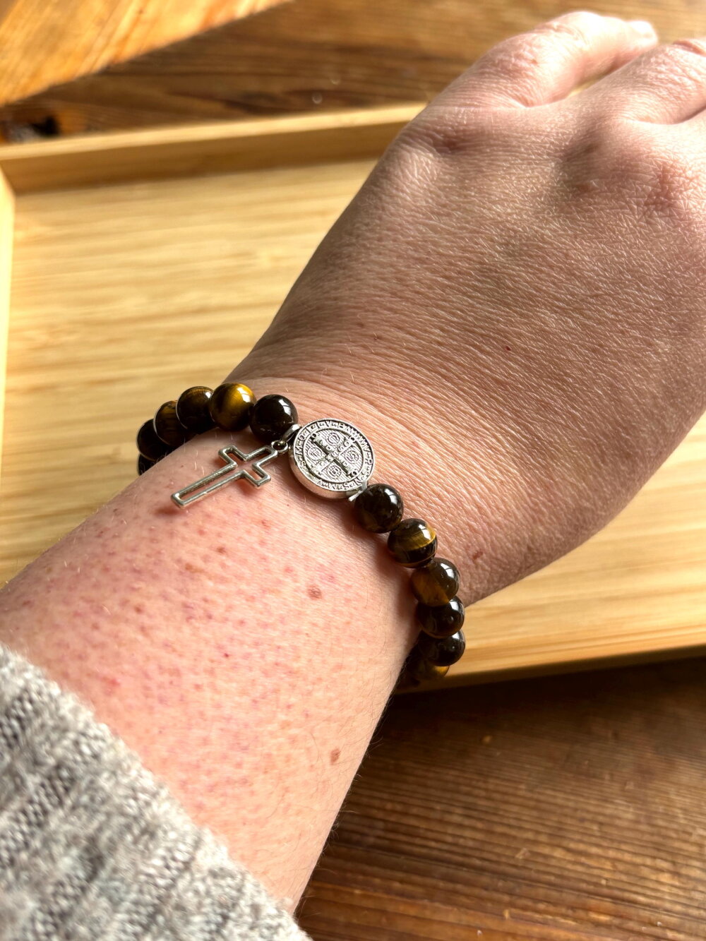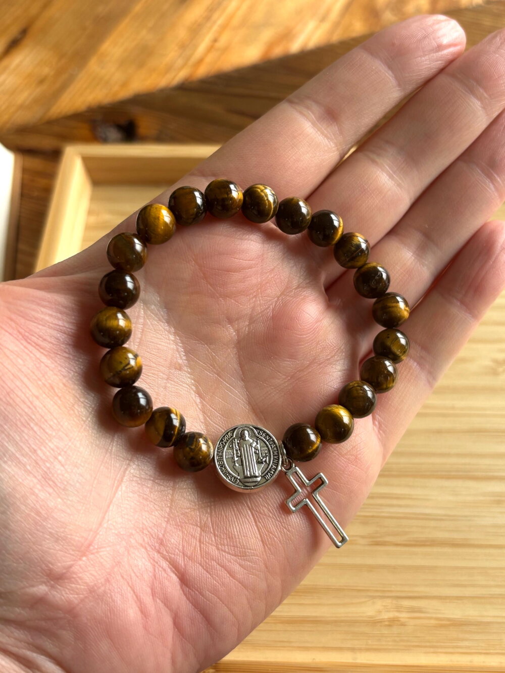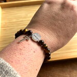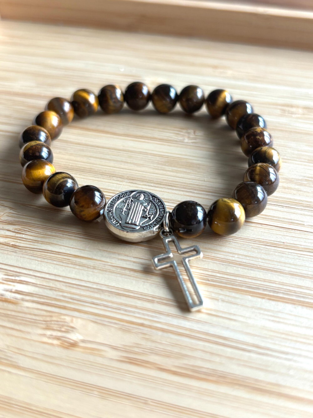 Bracelet chapelet Chrétien fait main composé de perles en pierre naturelle œil de tigre de 6 mm, et d’une perle médaille de Saint et sa croix.