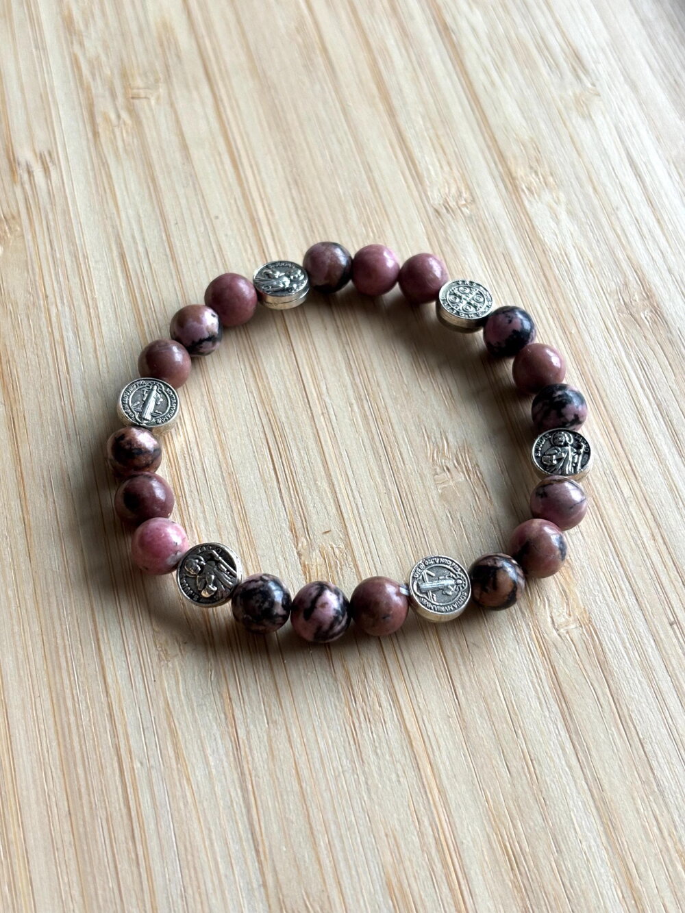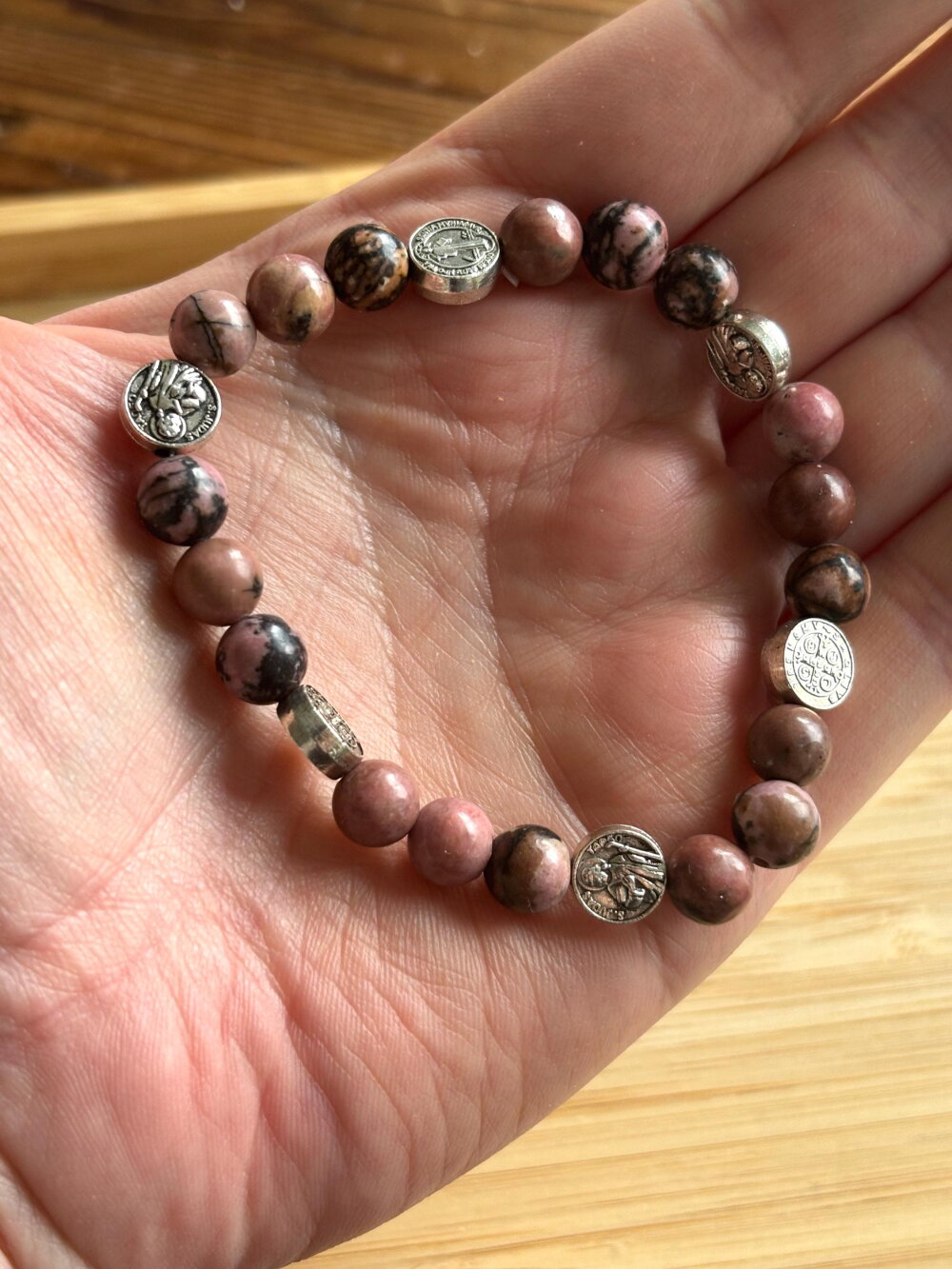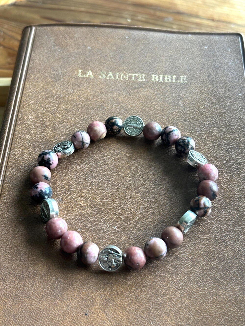 Bracelet chapelet Chrétien fait main composé de perles en pierre naturelle rhodonite de 8 mm, et de perles médailles de Saint.