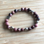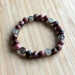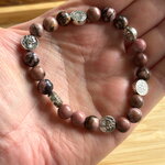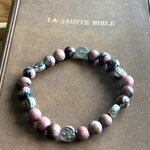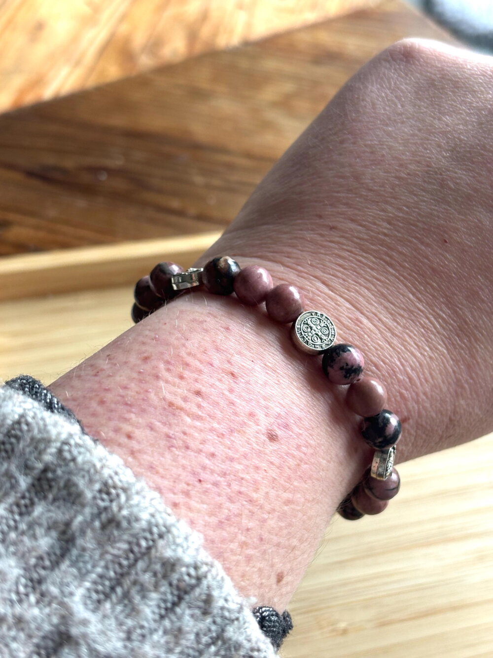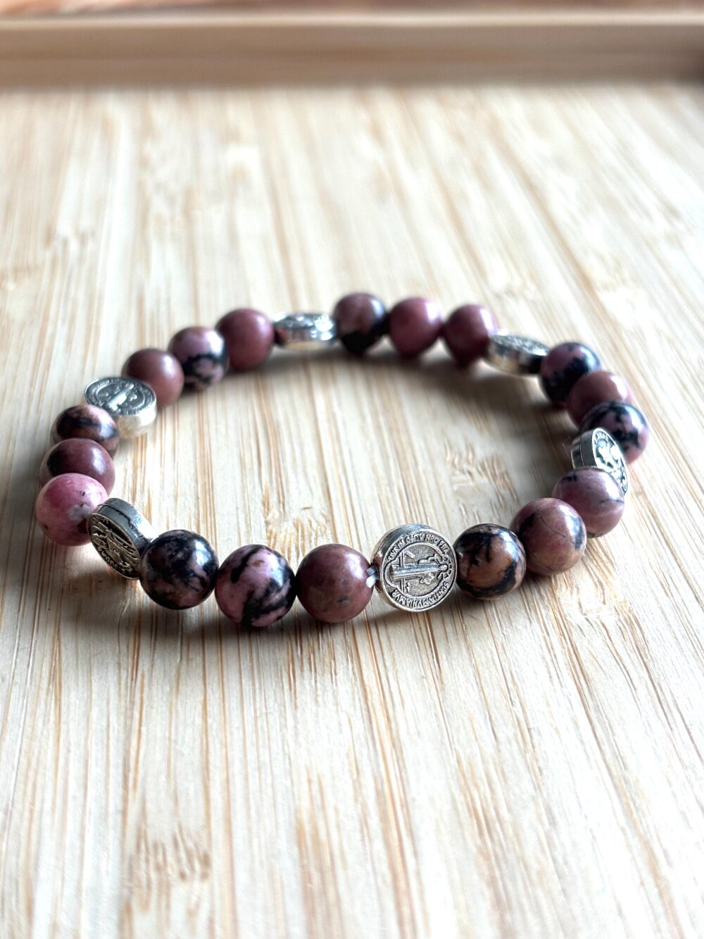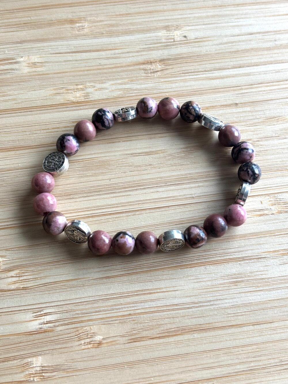 Bracelet chapelet Chrétien fait main composé de perles en pierre naturelle rhodonite de 8 mm, et de perles médailles de Saint.
