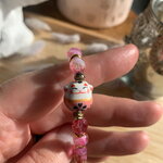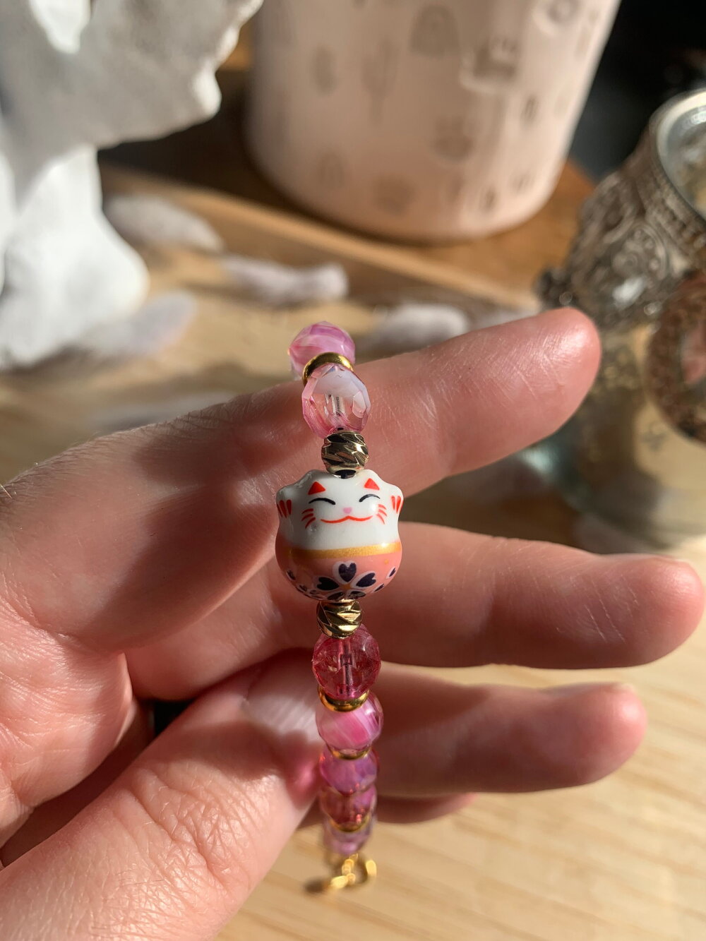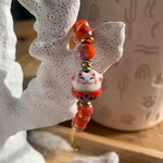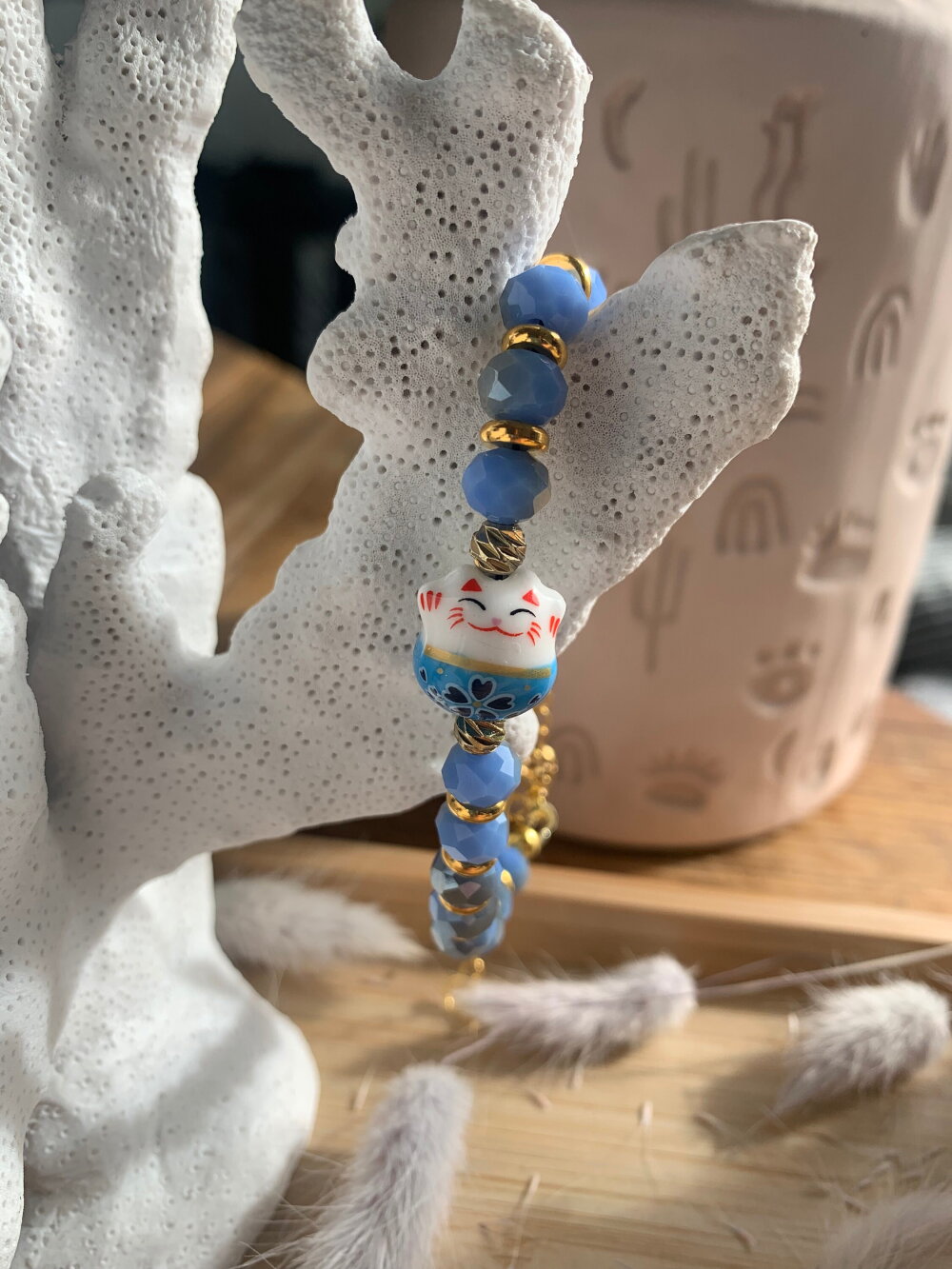 Bracelet chat porte bonheur, fait main avec des perles en cristal de bohème, et en pièce principale un chat Chinois en porcelaine.